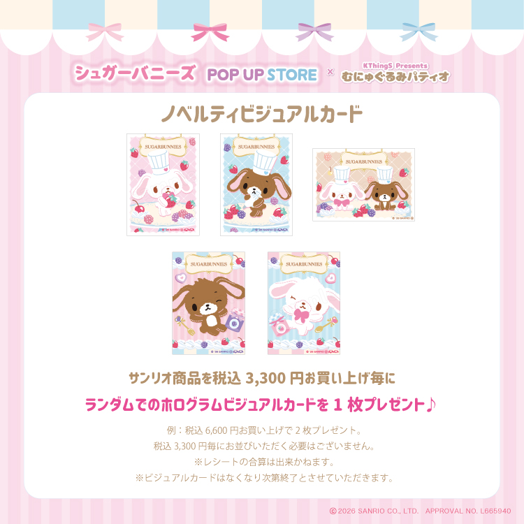 「シュガーバニーズ」ポップアップストアにて、グッズをお買い上げ3,300円(税込)毎に特典として「ホログラムビジュアルカード」が1枚プレゼントされる。