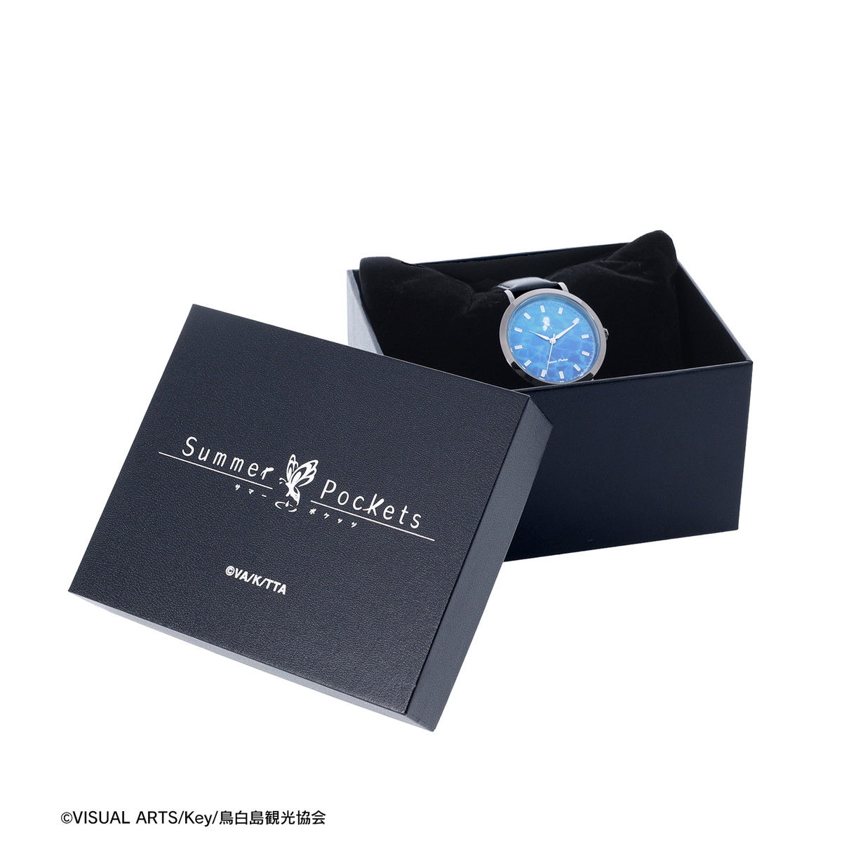 サマポケで象徴的に描かれている「海」や「七影蝶」をモチーフしたデザインと、メインヒロイン「鳴瀬しろは」をイメージした2種類の『腕時計』が予約受付スタート! 時計箱は黒をベースにしたタイトルロゴを箔押しされたオリジナルBOXでお届け。 しろはと一緒に時を刻もう。
