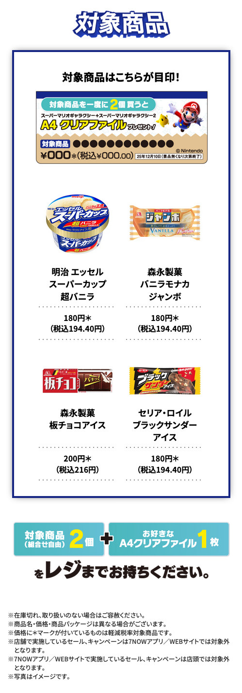 2025年11月27日より全国のセブンイレブンにて、対象商品2個と「マリオ A4クリアファイル 全5種」よりお好きなデザインを1つレジまで持って対象商品を購入すると、セブンイレブン限定の「マリオ」景品をプレゼント!