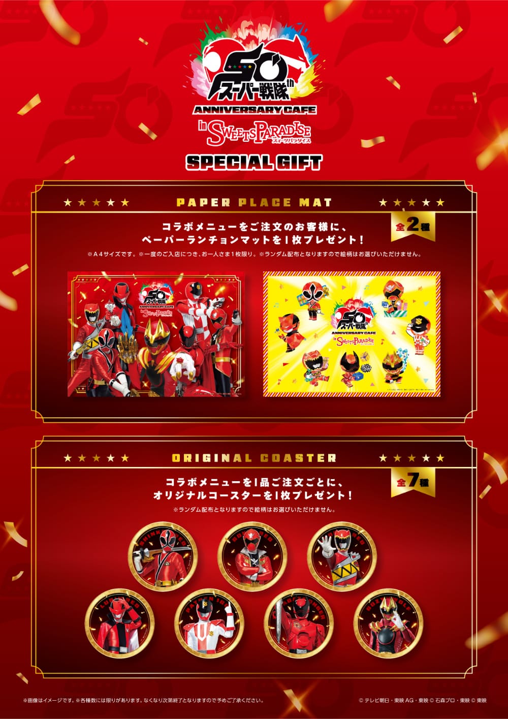 また、メニューの注文やカフェ利用、グッズ購入などに応じて「スーパー戦隊カフェ」カフェ限定のノベルティーがプレゼントされる。