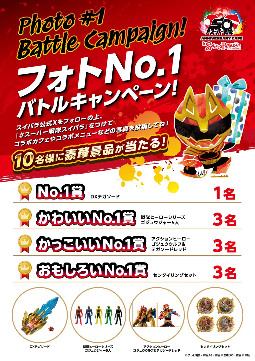 「侍戦隊シンケンジャー」シンケンレッド、「海賊戦隊ゴーカイジャー」ゴーカイレッド、「獣電戦隊キョウリュウジャー」キョウリュウレッド、「快盗戦隊ルパンレンジャー」ルパンレッド、「警察戦隊パトレンジャー」パトレン1号、「王様戦隊キングオージャー」クワガタオージャー、「ナンバーワン戦隊ゴジュウジャー」ゴジュウウルフをイメージしたメニューが登場!