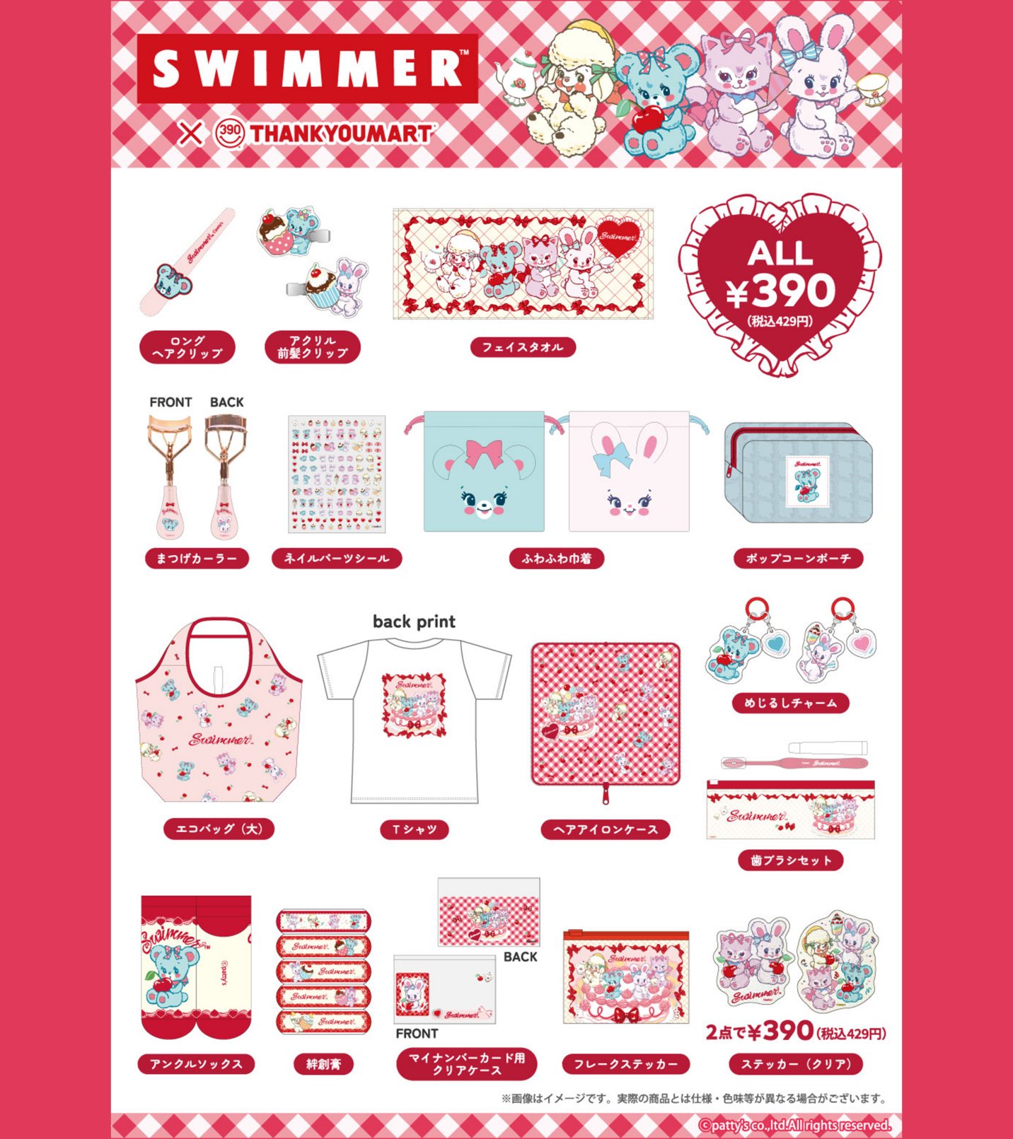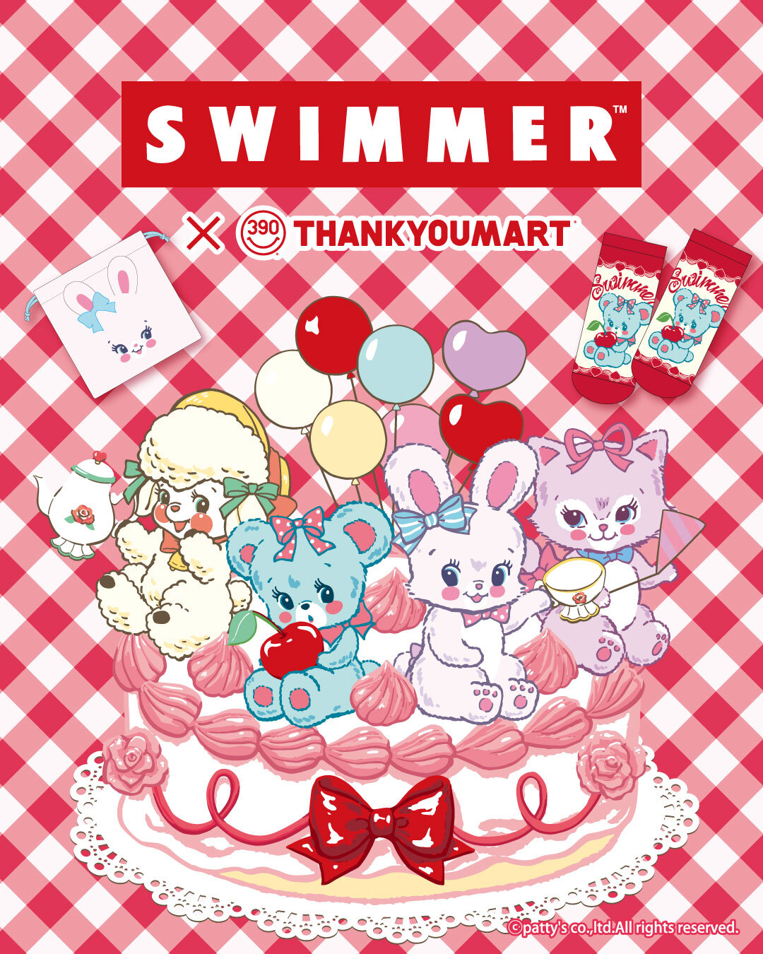 動物やスイーツなどをモチーフにしたデザインが人気のブランド「SWIMMER (スイマー)」 × サンキューマート全国にて、2026年5月上旬よりコラボグッズが発売される。