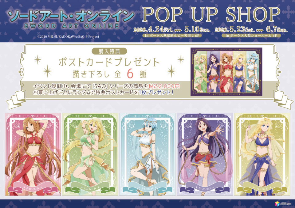 「ソードアート・オンライン(SAO)」ポップアップストアにて、グッズをお買い上げ2,000円(税込)毎に特典として「ボストカード 全6種」がランダムに1枚プレゼントされる。