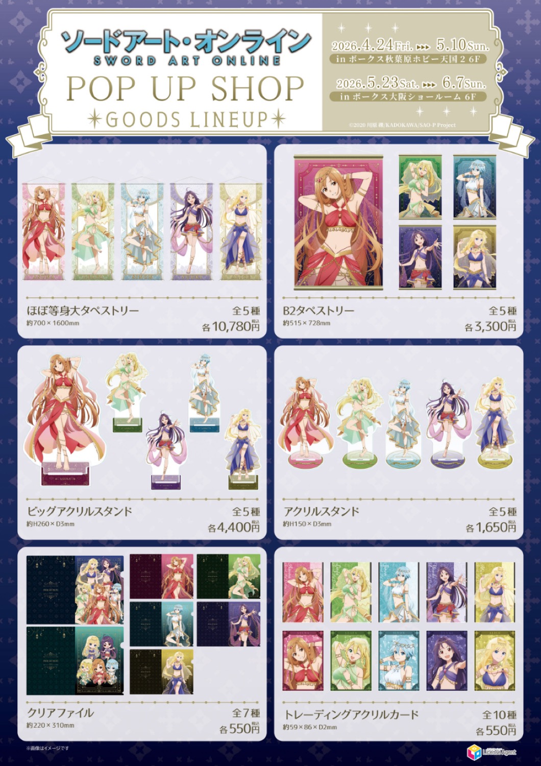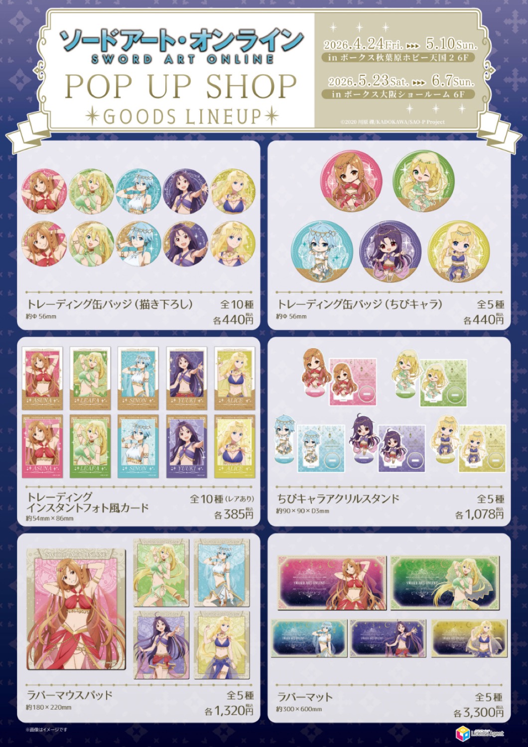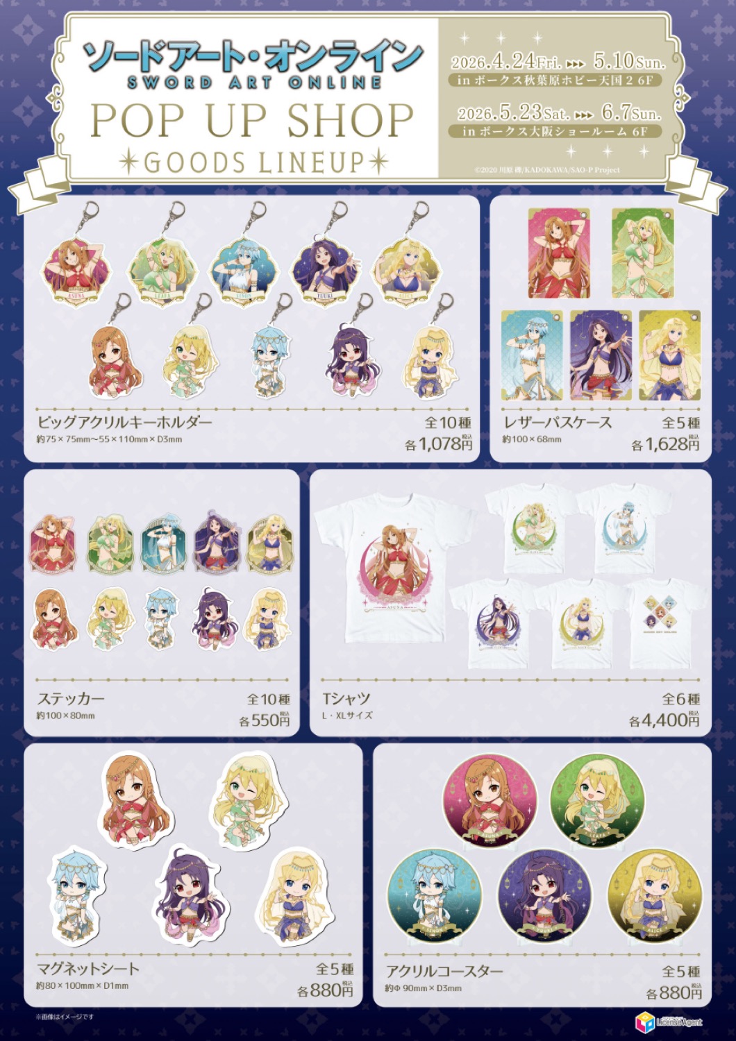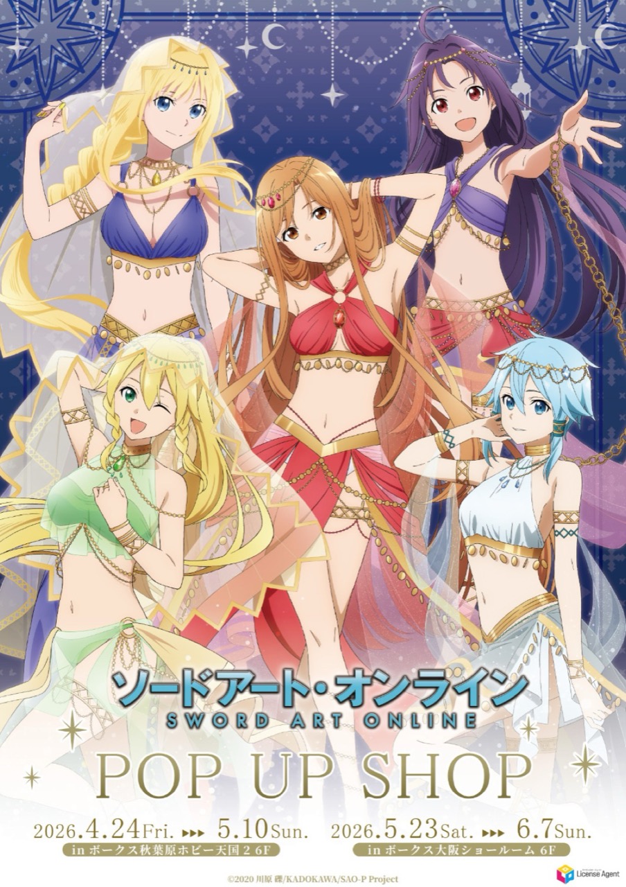 アニメ「ソードアート・オンライン(SAO)」ポップアップストアでは、アスナ・アリス・シノン・リーファ・ユウキたちが踊り子衣装に身を包む、描き下ろしイラストを使用した新作グッズが多数販売!