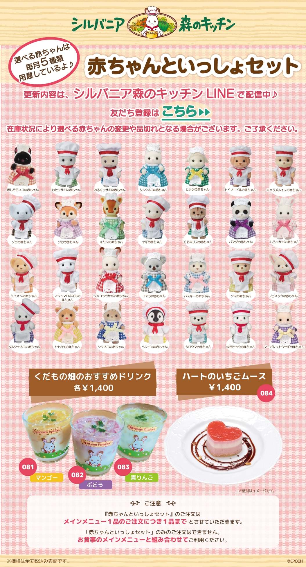 また、「赤ちゃんといっしょセット」では、デザートなどと一緒に好みの赤ちゃん人形が選べる、ファン必見の大人気メニューとなっている。