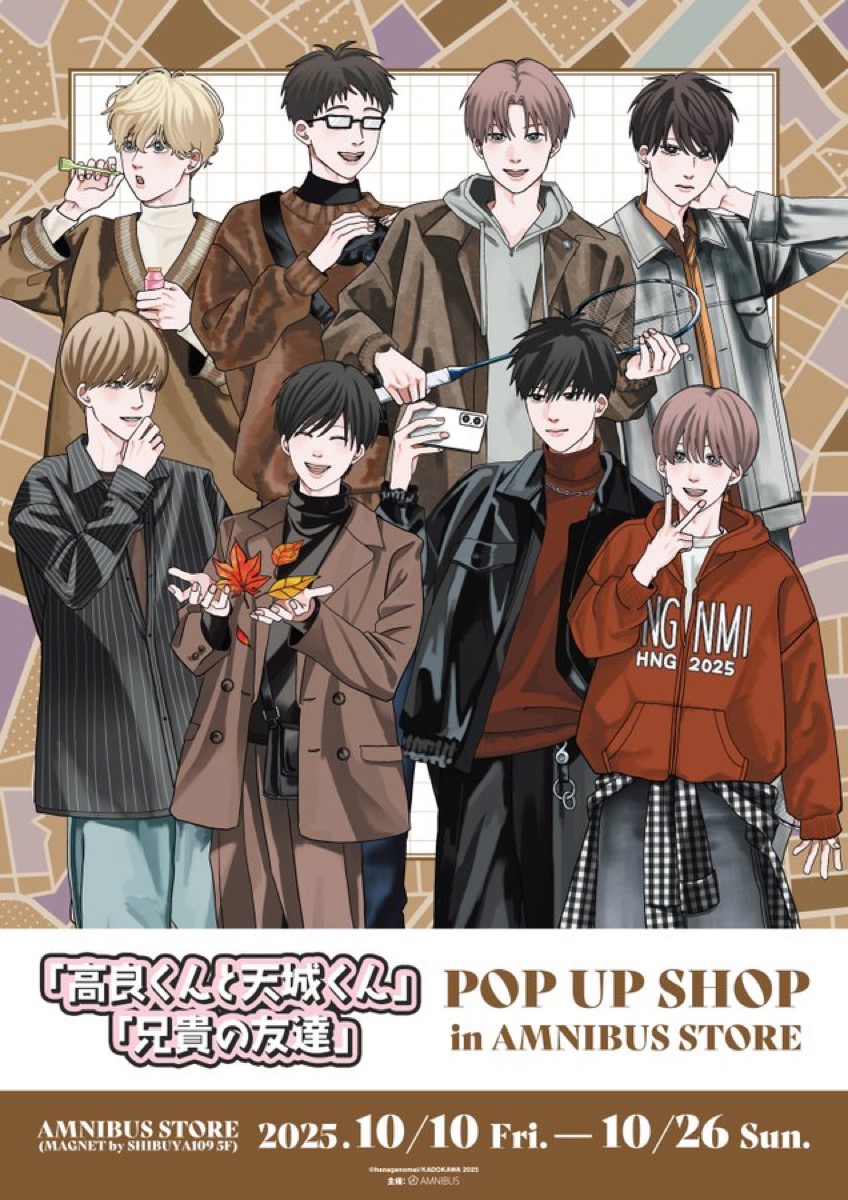 はなげのまい先生による人気BL漫画「高良くんと天城くん & 兄貴の友達」のポップアップストアが、MAGNET by SHIBUYA109にて2025年10月10日〜10月26日まで開催される。
