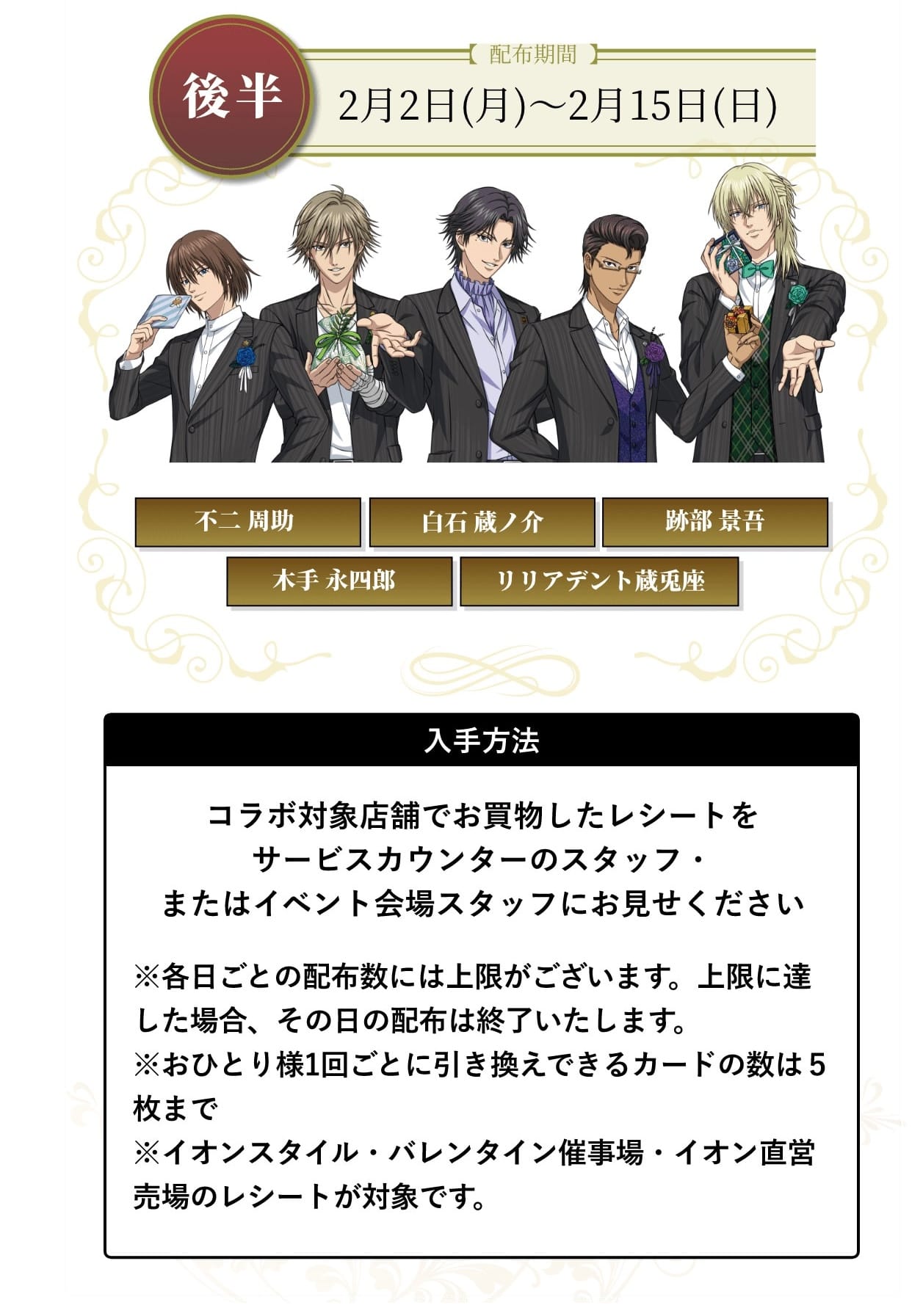 「テニプリ × イオン」コラボ第2弾では、越前リョーマ・手塚国光・不二周助・跡部景吾・幸村精市・木手永四郎・白石蔵ノ介・リリアデント蔵兎座・千石清純・忍足侑士たちが、プレゼントを手にスーツで揃えた描き下ろしイラストが登場。