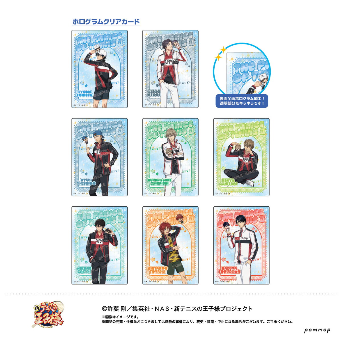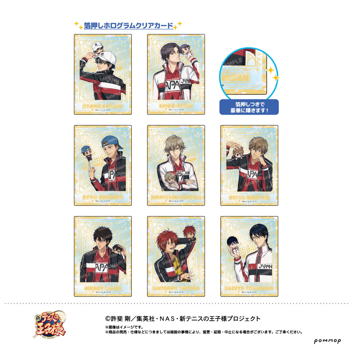 ジャージ姿で自分のぬいを可愛がる様子を描いた、越前リョーマ、跡部景吾、宍戸亮、白石蔵ノ介、忍足謙也、財前光、遠山金太郎、徳川カズヤら8人の「アクリルキーホルダー」と「ホログラムクリアカードコレクション」がラインナップ。
