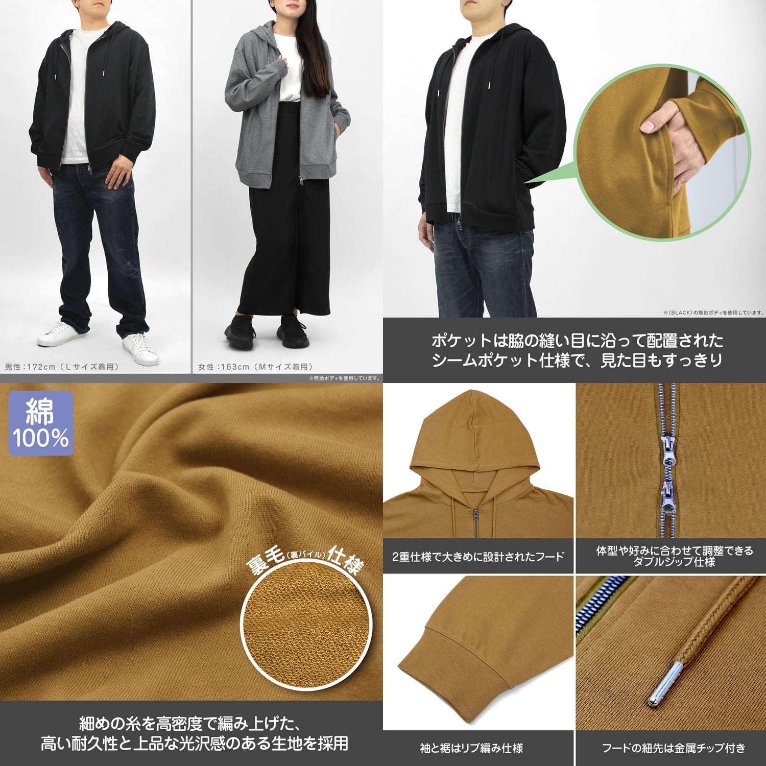 ・フードの紐先には金属チップ付きで、ほつれにくく長持ちします。