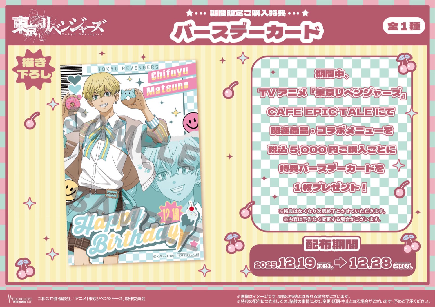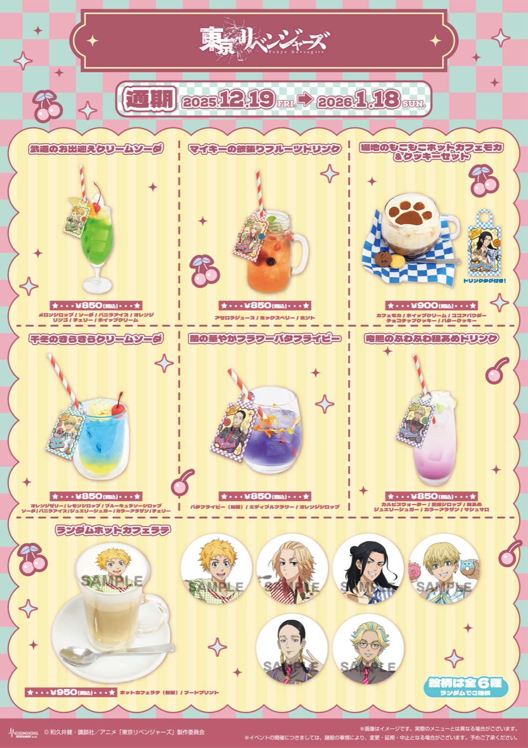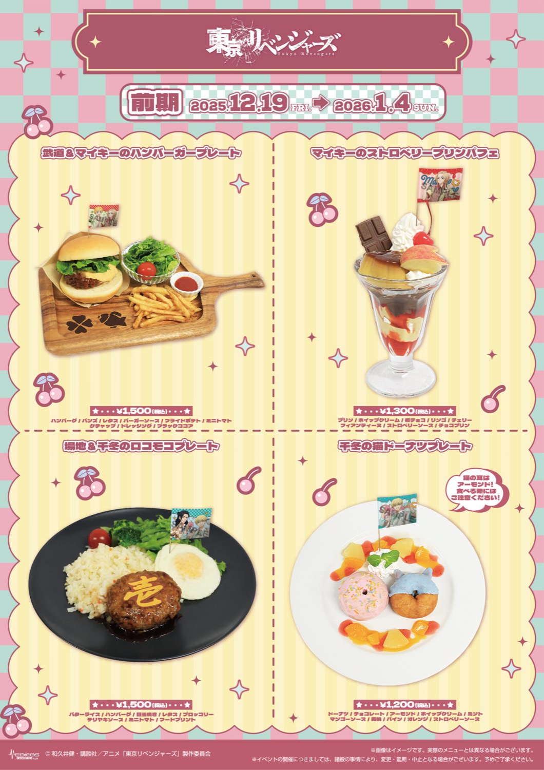 2025年12月19日〜2026年1月18日までの期間限定で開催される「東京リベンジャーズ カフェ」では、描き下ろしイラストを使用した新商品が登場!