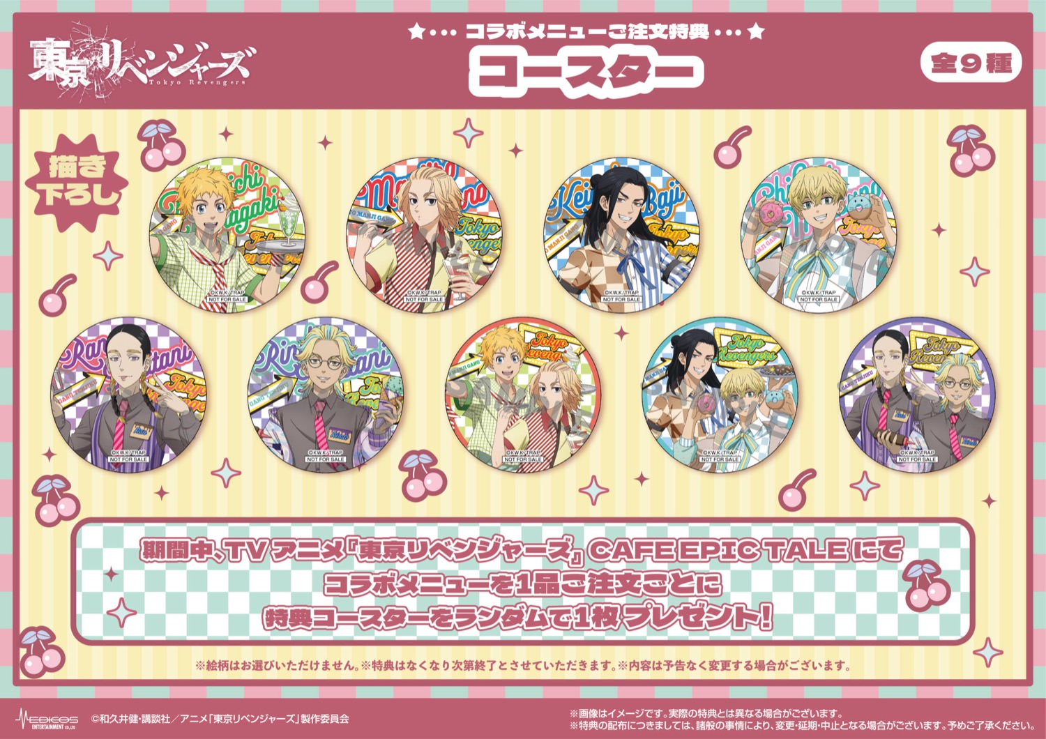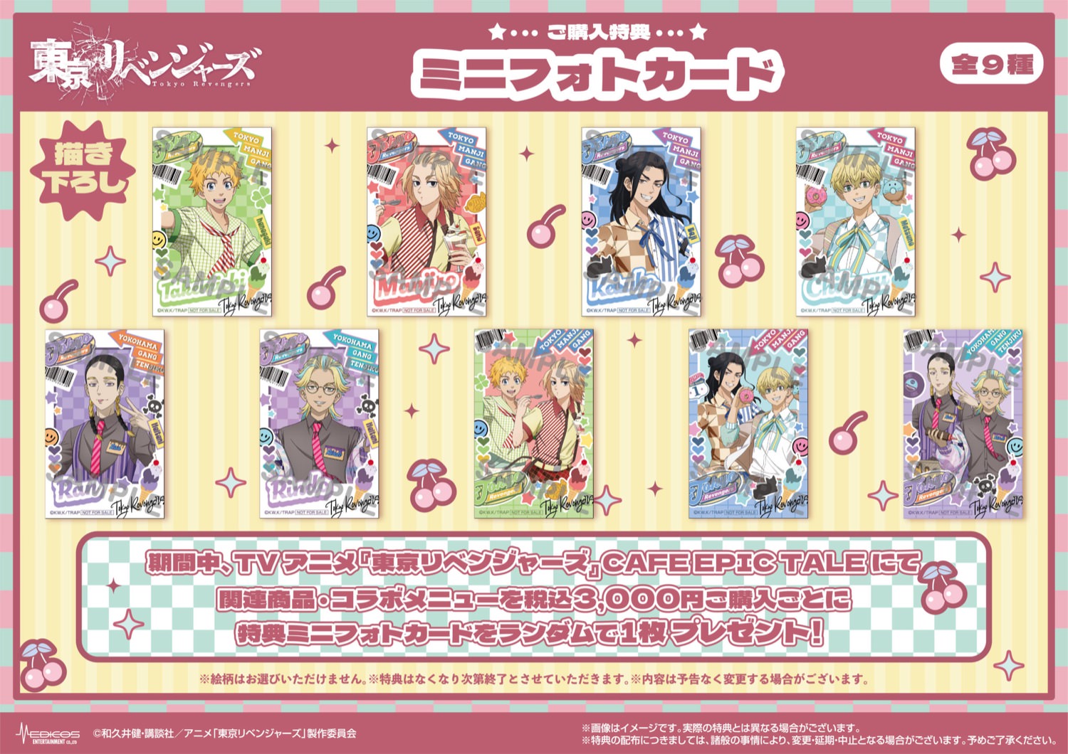 東京リベンジャーズ カフェにて、コラボメニューを1品ご注文ごとに特典「コースター(全9種)」をランダムで1枚、関連商品(コラボメニューを含む)を3,000円(税込)お買い上げごとに特典「ミニフォトカード(全9種)」、5,000円(税込)お買い上げごとに松野千冬の「バースデーカード(全1種)」を1枚プレゼント!