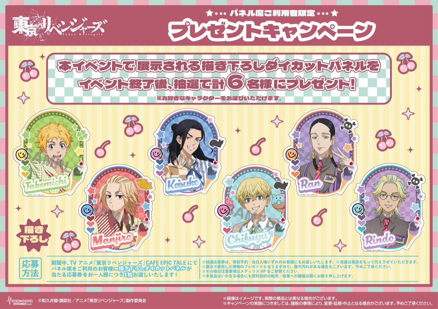 さらに、期間中、キャラクターパネル席をご利用いただいたお客様の中から抽選で6名様にコラボカフェ店内に展示されている描き下ろしダイカットパネルをプレゼント!