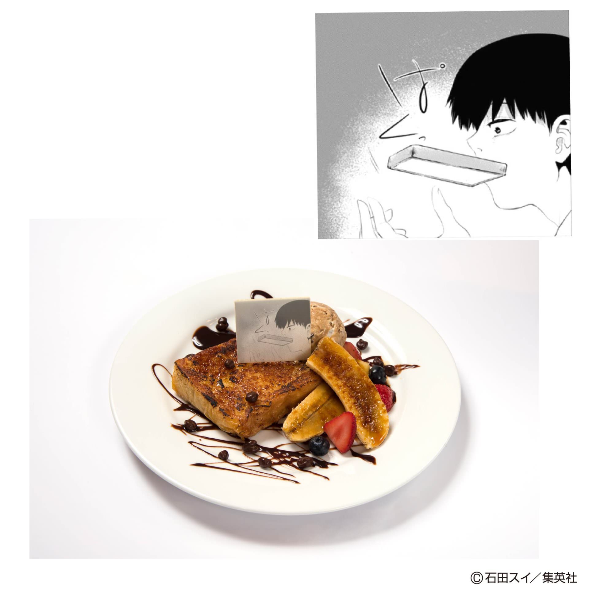 カネキがパンにコーヒーをまぶした場面をイメージしたアイス付きのフレンチトースト。 コーヒーシュガーをお好みでふりかけてください。コーヒーの風味でごまかさないでくださいね・・・ |