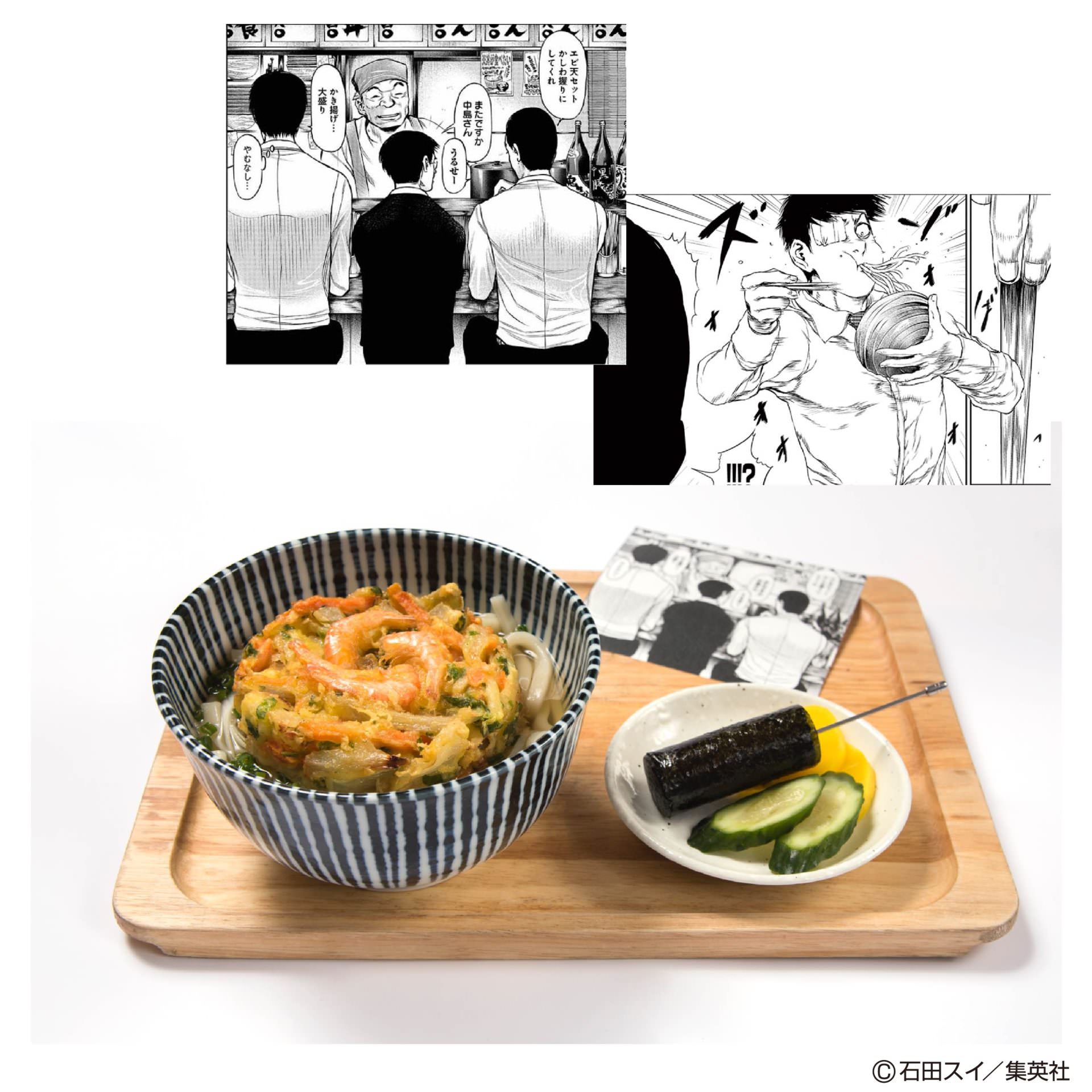 | 亜門が勤務後に食べたうどんをイメージ。クインケ風ソーセージもつき、ボリューム満点です。 ※場面カットカードはお持ち帰り頂けません。 |