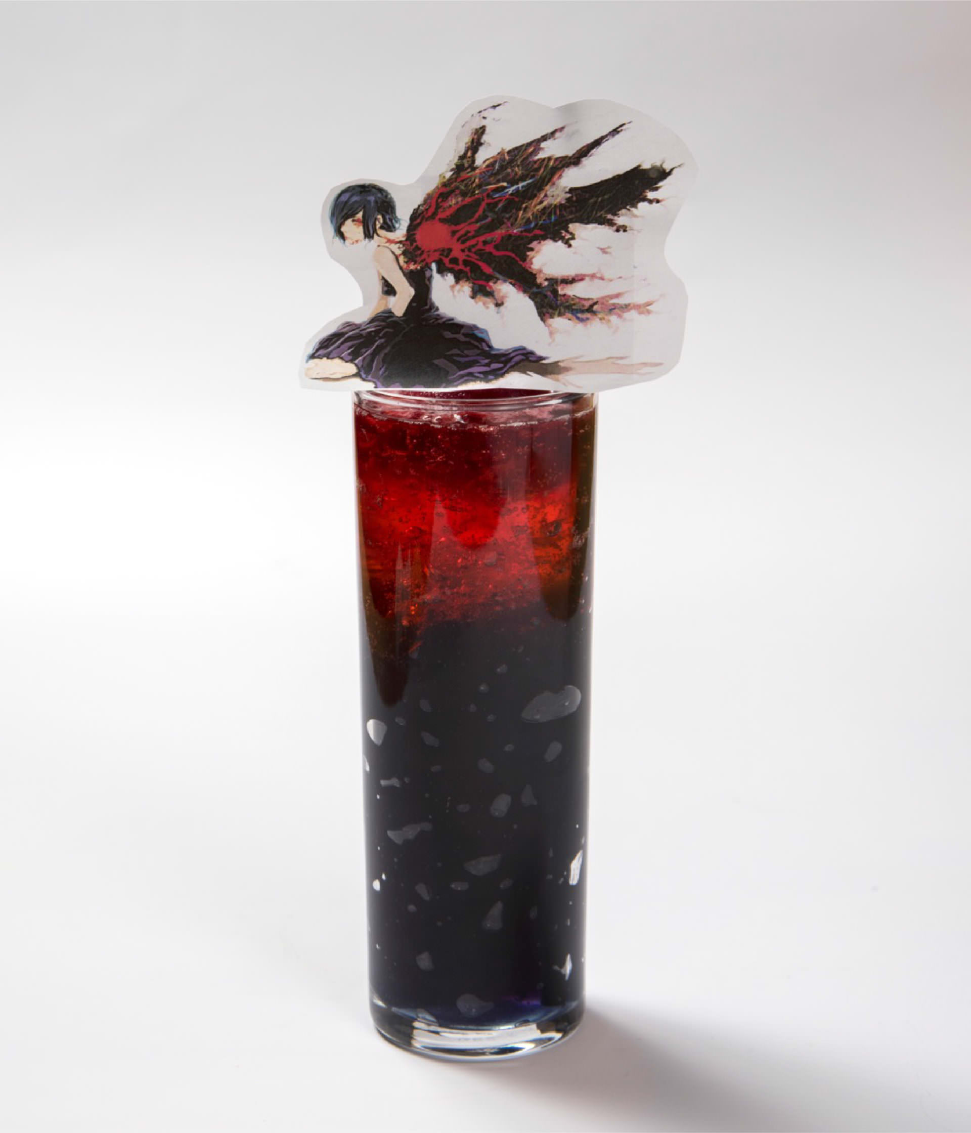 | トーカの赫子をイメージしたゼリードリンク。赤・青の赫子が美しいカラーイラストのモナカ付き。 | 呉緒をイメージしたバナナスムージー。いっしょについてくるアタッシュケースを開けると、呉緒の限定ステッカーが中にございます。 |
