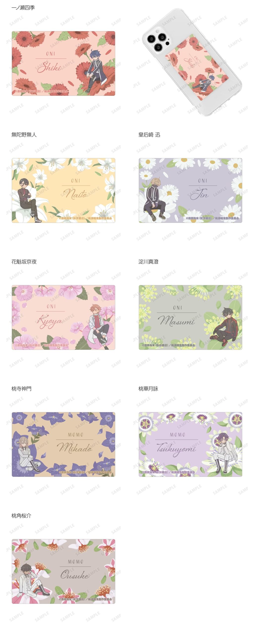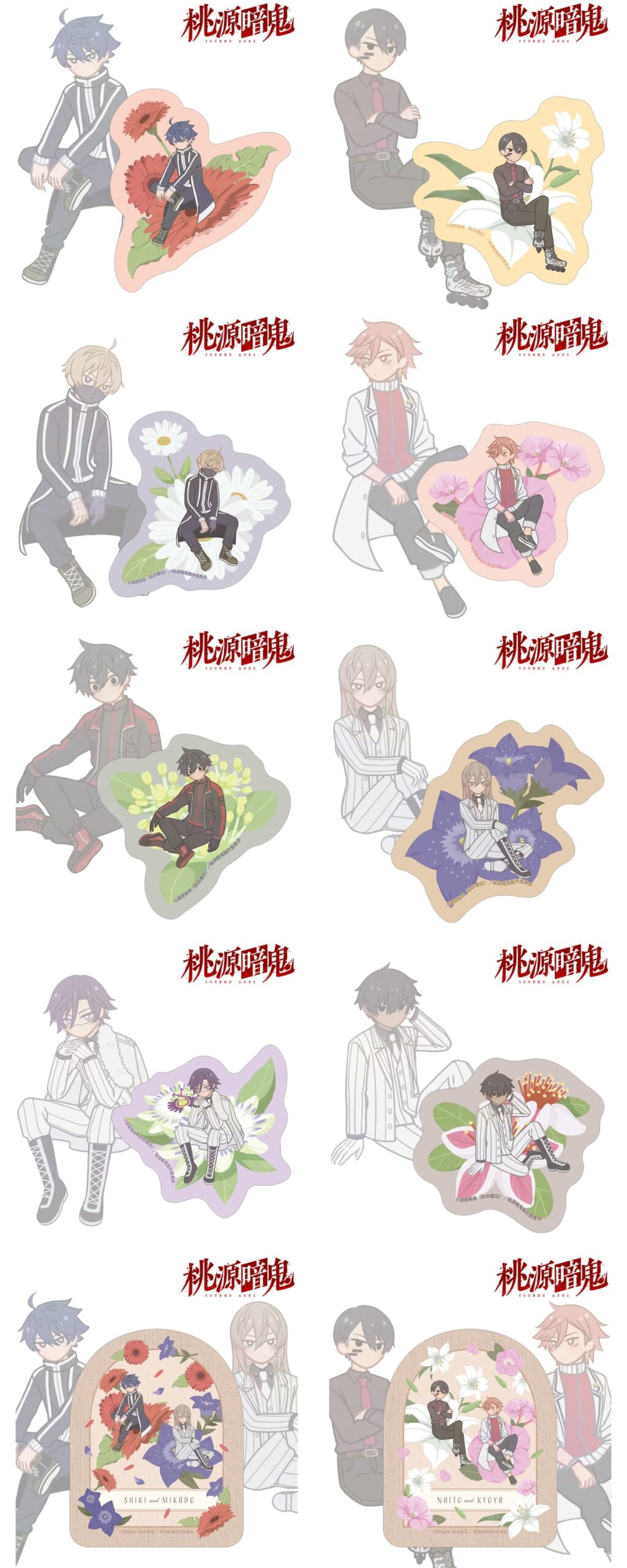 一ノ瀬四季、無陀野無人、皇后崎 迅、花魁坂京夜、淀川真澄、桃寺神門、桃華月詠、桃角桜介のイラストをボタニカルデザインに落とし込んで繊細なタッチで新たに描き起こし、カードステッカーに仕上げました。