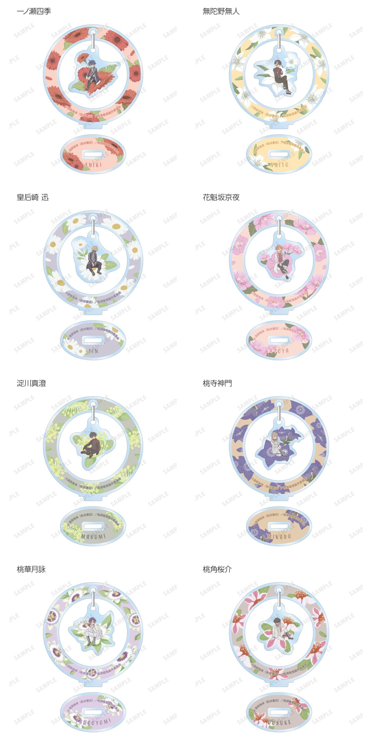 一ノ瀬四季、無陀野無人、皇后崎 迅、花魁坂京夜、淀川真澄、桃寺神門、桃華月詠、桃角桜介のイラストをボタニカルデザインに落とし込んで繊細なタッチで新たに描き起こし、ゆらゆら動くアクリルスタンドに仕上げました。