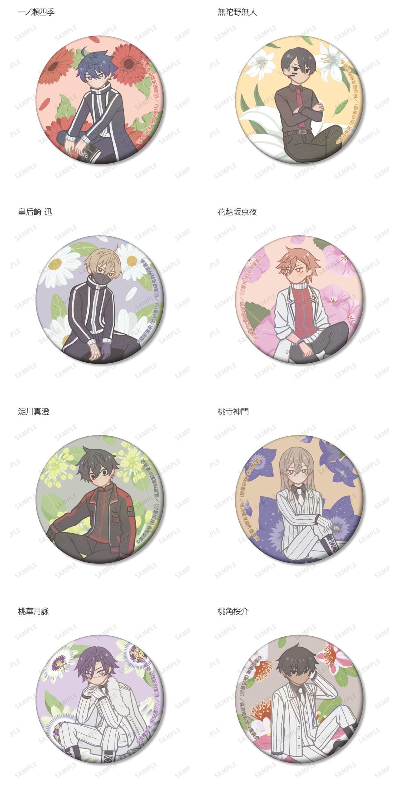 一ノ瀬四季、無陀野無人、皇后崎 迅、花魁坂京夜、淀川真澄、桃寺神門、桃華月詠、桃角桜介のイラストをボタニカルデザインに落とし込んで繊細なタッチで新たに描き起こし、マットな手触りの缶バッジに仕上げました。