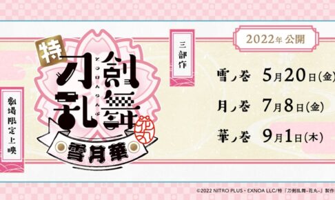 劇場用アニメ「特『刀剣乱舞-花丸-』~雪月華~」は、第一部・雪ノ巻が2022年5月20日より公開。続く第二部・月ノ巻は7月8日、華ノ巻は9月1日より公開!