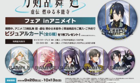 日本刀を擬人化した刀剣男士が活躍する大人気ゲーム「刀剣乱舞 (とうらぶ)」を原作としたアニメ「刀剣乱舞 廻 -虚伝 燃ゆる本能寺-」のフェアが、全国のアニメイトにて2024年9月28日〜10月13日までの期間開催!
