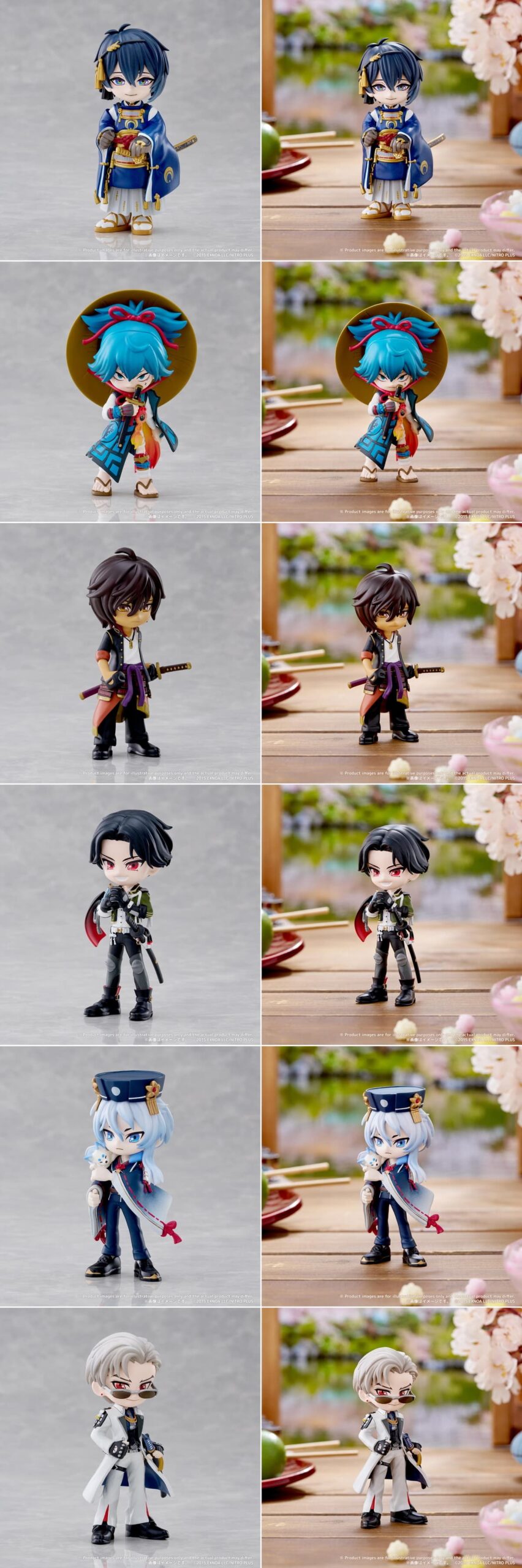 手のひらサイズながら、各刀剣男士の立ち姿や装いが再現されている。