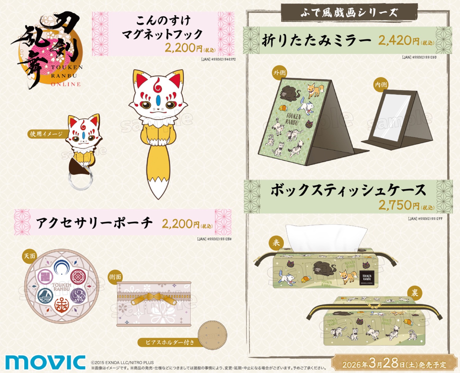 描き下ろしイラストを使用した「こんのすけ マグネットフック」や「アクセサリーポーチ」「硬質カードケース」「レーザーカットしおり」などがラインナップする。