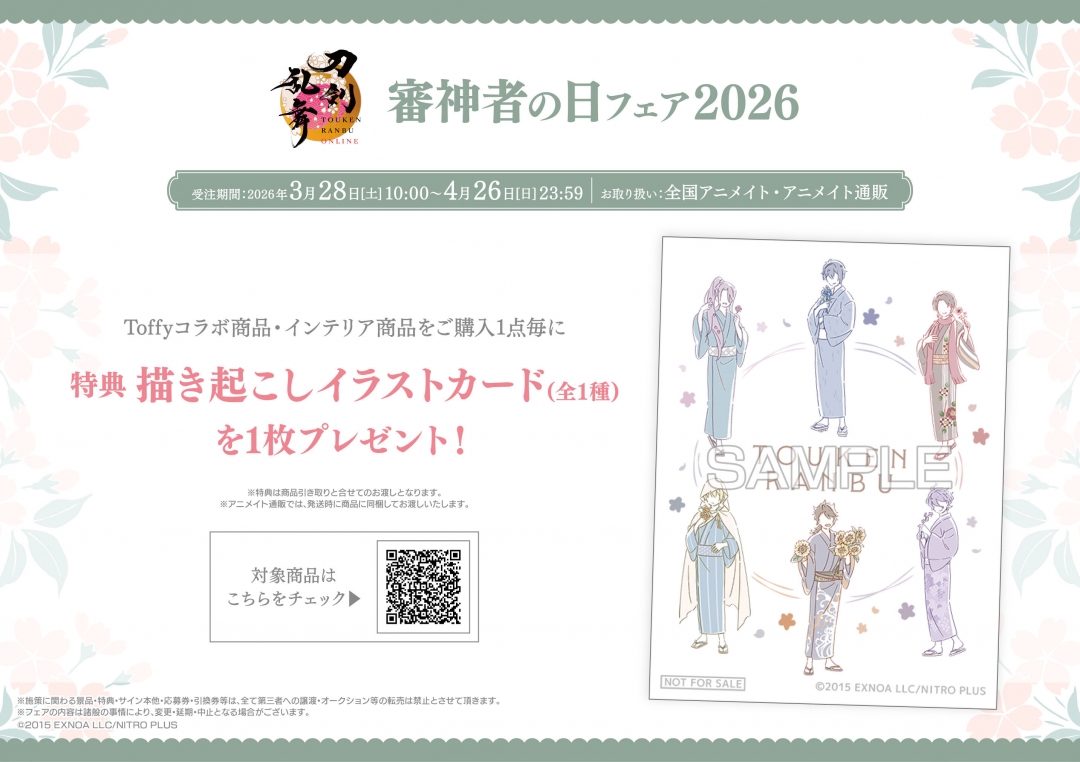 日本刀を擬人化した刀剣男士が活躍する大人気ゲーム「刀剣乱舞 -ONLINE- (とうらぶ)」の『刀剣乱舞ONLINE 審神者の日フェア 2026』が、全国のアニメイトにて2026年3月28日〜4月26日までの期間限定で開催される。