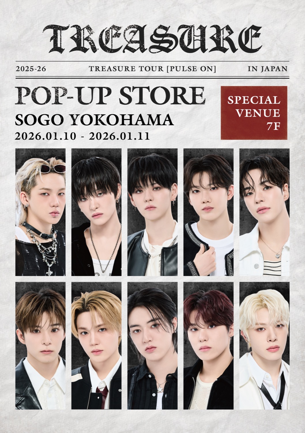 YGエンターテインメントに所属する韓国の10人組大人気アイドルグループ「TREASURE (トレジャー)」のポップアップストアが、そごう横浜にて2026年1月10日〜1月11日まで開催される。