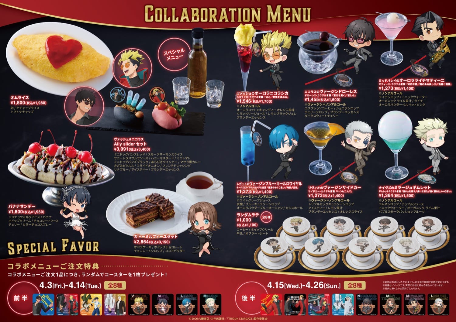 2026年4月3日〜4月23日まで開催される「TRIGUN STARGAZE」カフェでは、描き下ろしイラストや描き起こしミニキャライラストを使用したコラボカフェ限定グッズが多数登場!