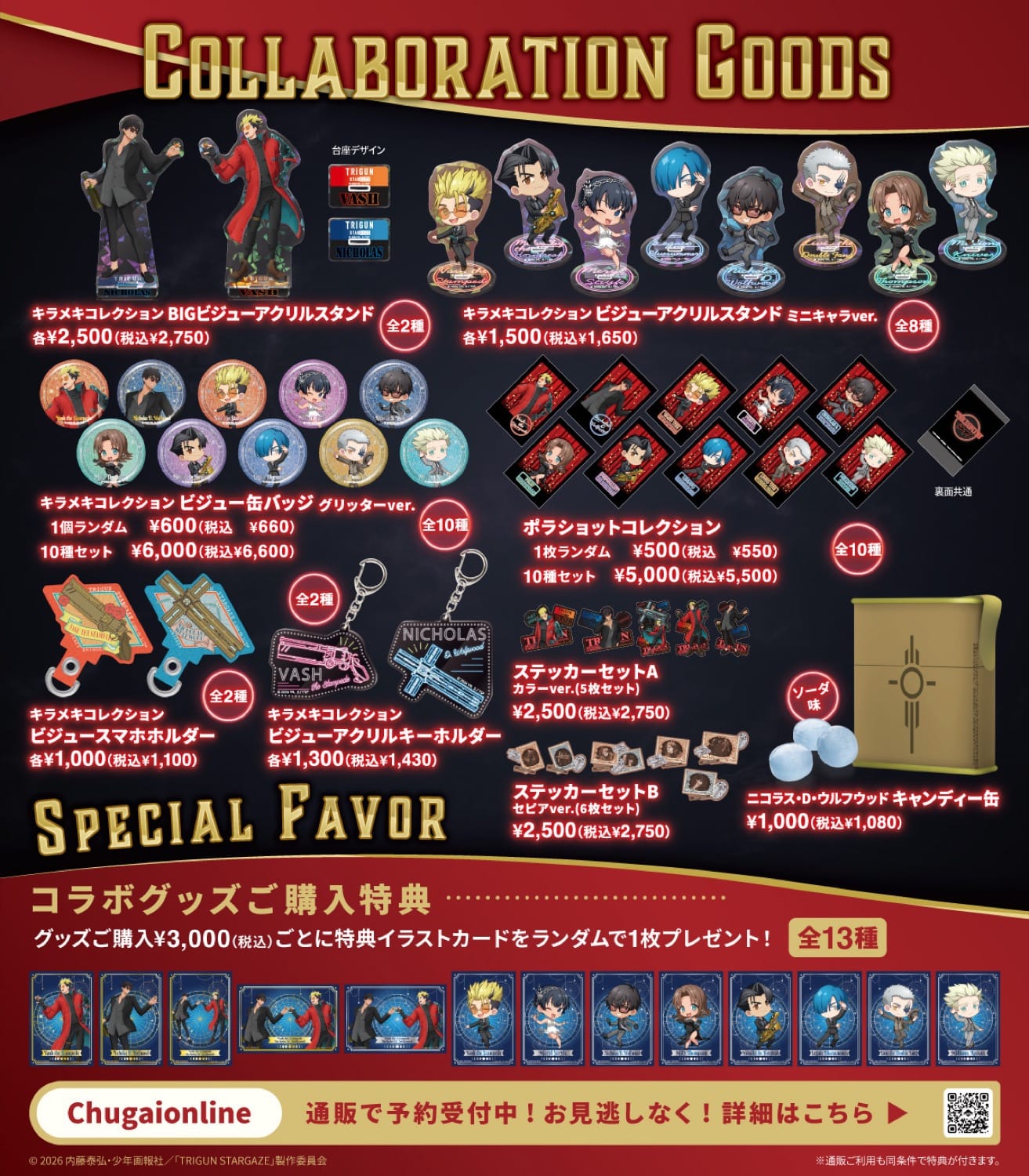 「TRIGUN STARGAZE × Chugai Grace Cafe渋谷/大阪」コラボでは、コラボメニューの注文やWeb予約、コラボグッズの購入などに応じて各種ノベルティがプレゼントされる。