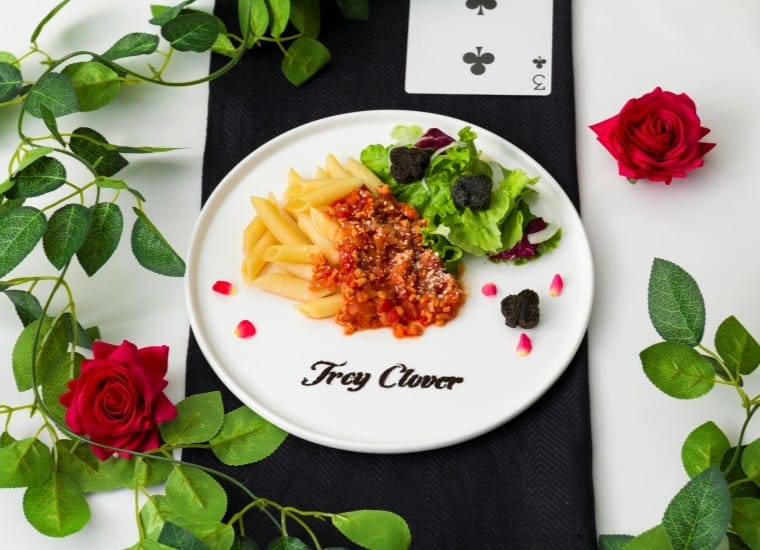 ハーツラビュル寮のティーパーティーをイメージした「なんでもない日のティーパーティー」や「<リドル・ローズハート>クラウンサラダ」「<エース・トラッポラ>オレンジクラフティ」などのメニューがラインナップする。
