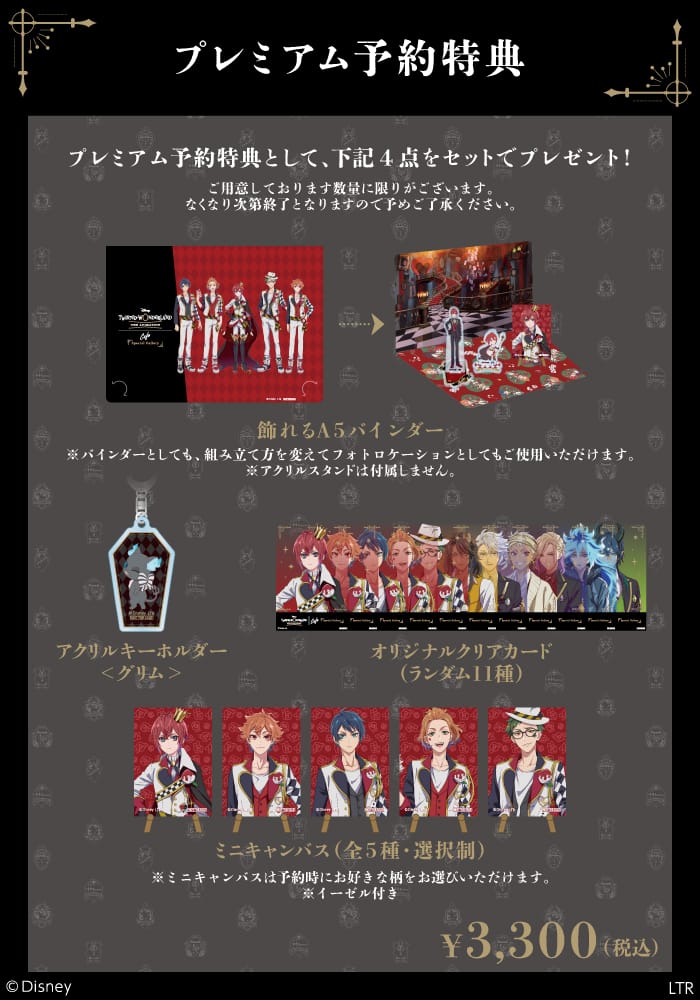 「プレミアム予約(税込3,300 円/1名)」にてカフェを利用すると、特典としてノベルティを4点セット「飾れるA5バインダー」「アクリルキーホルダー<グリム>」「オリジナルクリアカード(ランダム11種)」「ミニキャンバス(全5種・選択制)」をプレゼント!