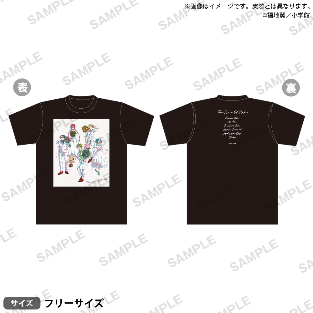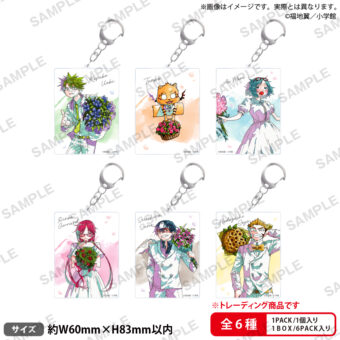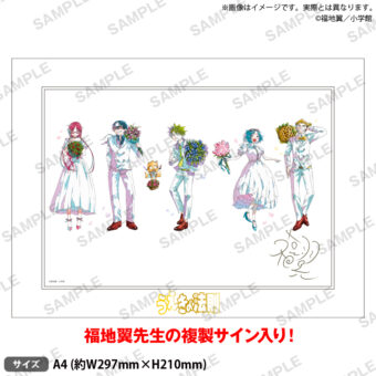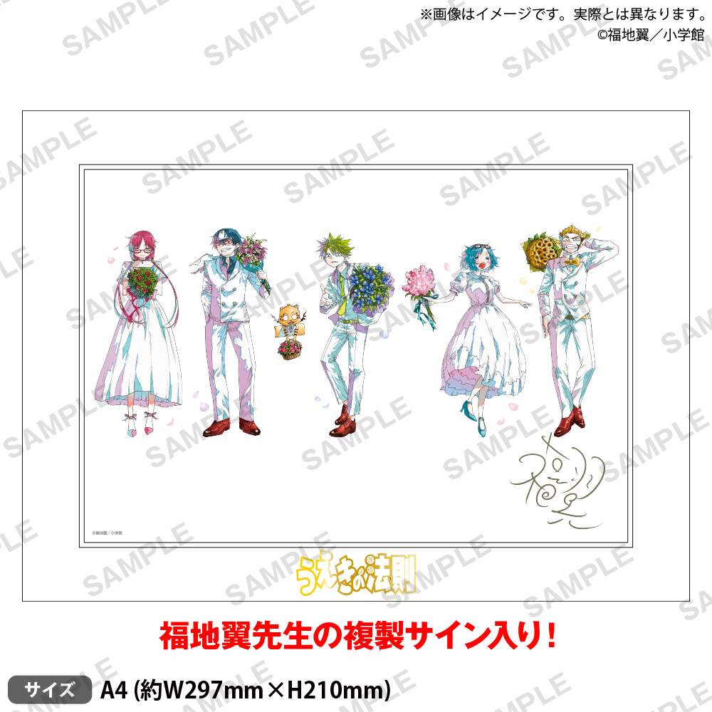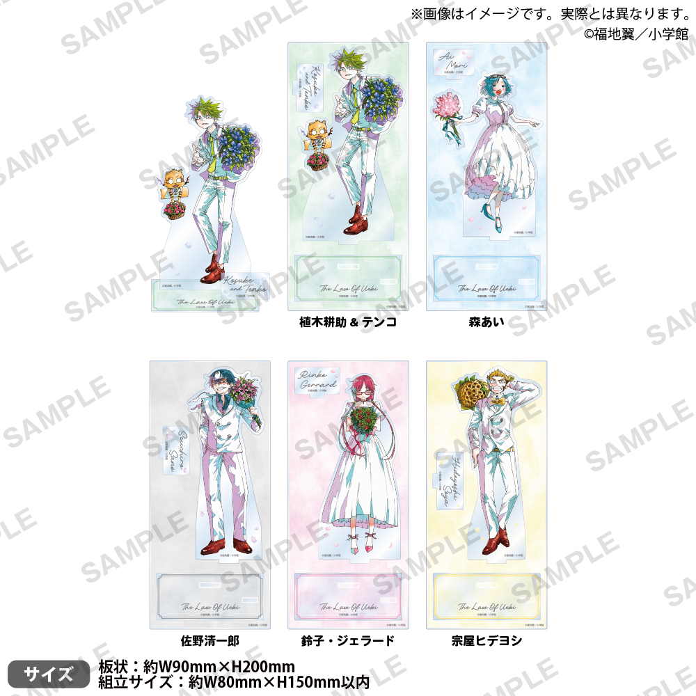 「うえきの法則 25周年記念 ポップアップストア」では、白い正装に身を包む、植木耕助 / 森あい / 佐野清一郎 / 鈴子・ジェラード / 宗屋ヒデヨシたちが、花束を手に25周年をお祝いする描き下ろしイラストを使用したグッズが多数ラインナップ!