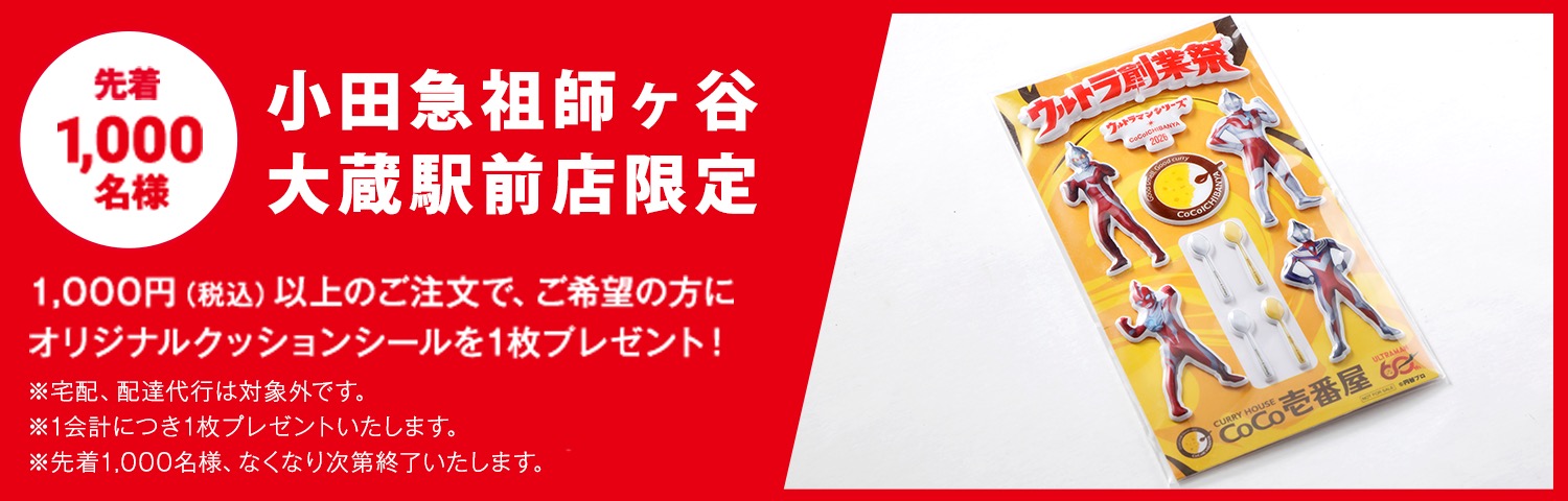 さらに、キャンペーン期間中は、東京・祖師ヶ谷大蔵の「ウルトラマン商店街」にある「CoCo壱番屋 小田急祖師ヶ谷大蔵駅前店」にて、1,000円(税込)以上注文した方先着1,000名に「オリジナルクッションシール」を1会計につき1枚プレゼント!