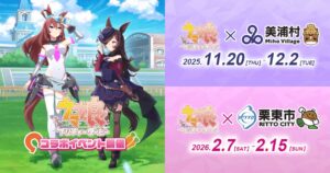 Cygames (サイゲームス) が贈る大人気の育成アプリゲーム「ウマ娘 プリティーダービー」と、日本中央競馬会の競走馬たちのトレーニングセンターがある茨城県美浦村 & 滋賀県栗東市のコラボが開催決定! 美浦村コラボは2025年11月20日〜12月2日、栗東市コラボは2026年2月7日〜2月15日まで行われる。