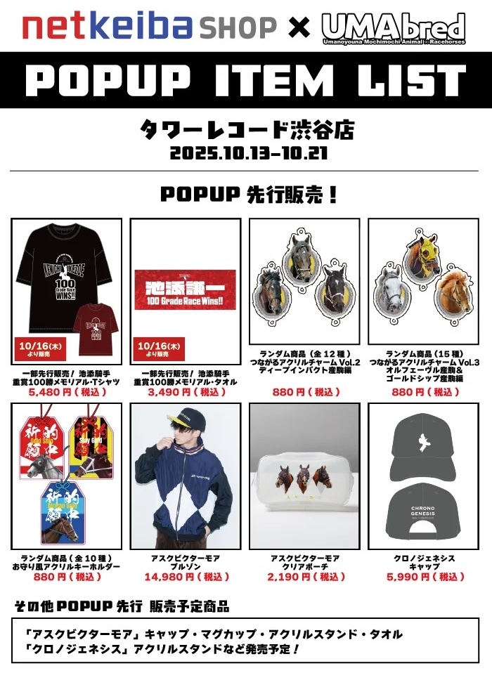 2025年10月13日より、タワーレコード渋谷店にて「UMAbred × netkeiba」の競走馬グッズを販売するポップアップストアを開催!