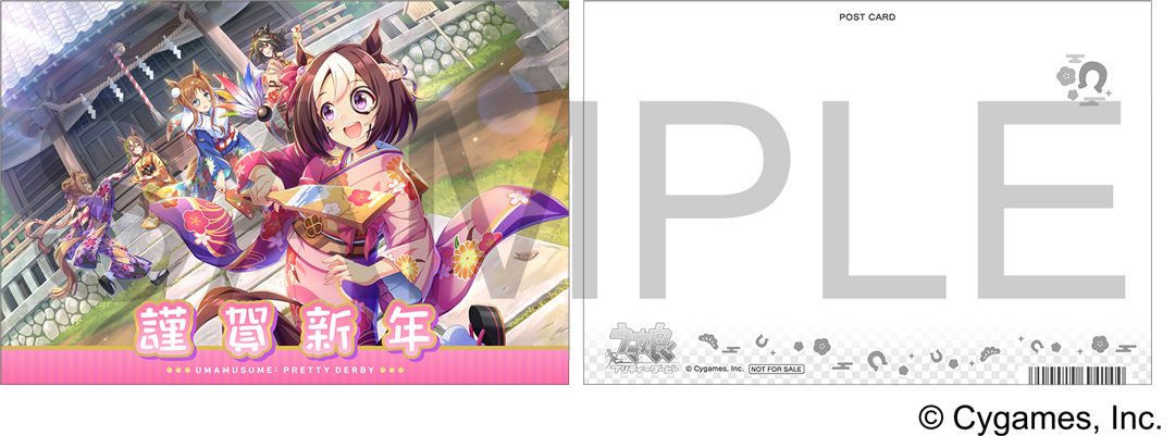 イベント開催期間中、『ウマ娘 プリティーダービー』関連のグッズを1点以上購入した方に、着物姿で羽根つきを楽しむスペシャルウィークらのイラストをデザインした「年賀状風ポストカード」を1枚プレゼント!