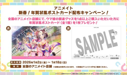 Cygames (サイゲームス) が贈る大人気の育成アプリゲーム「ウマ娘 プリティーダービー」× アニメイト全国にて、2026年1月2日から1月18日まで「『ウマ娘 プリティーダービー』新春!年賀状風ポストカード配布キャンペーン!」が開催される。