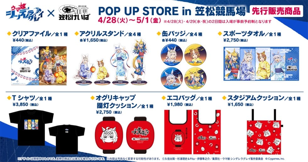 2026年4月28日より開催される「ウマ娘 × 笠松けいば」コラボでは、アニメ『ウマ娘 シンデレラグレイ』と笠松競馬場がコラボしたグッズを先行販売するポップアップストアを実施。