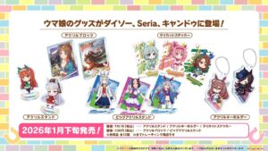 Cygames (サイゲームス) が贈る大人気の育成アプリゲーム「ウマ娘 プリティーダービー」× ダイソー/Seria (セリア)/キャンドゥにて、2026年1月下旬よりオリジナルグッズが発売される。アクリルスタンド、アクリルブロック、ダイカットステッカーなど、お手頃価格のアイテムが多数ラインナップ!