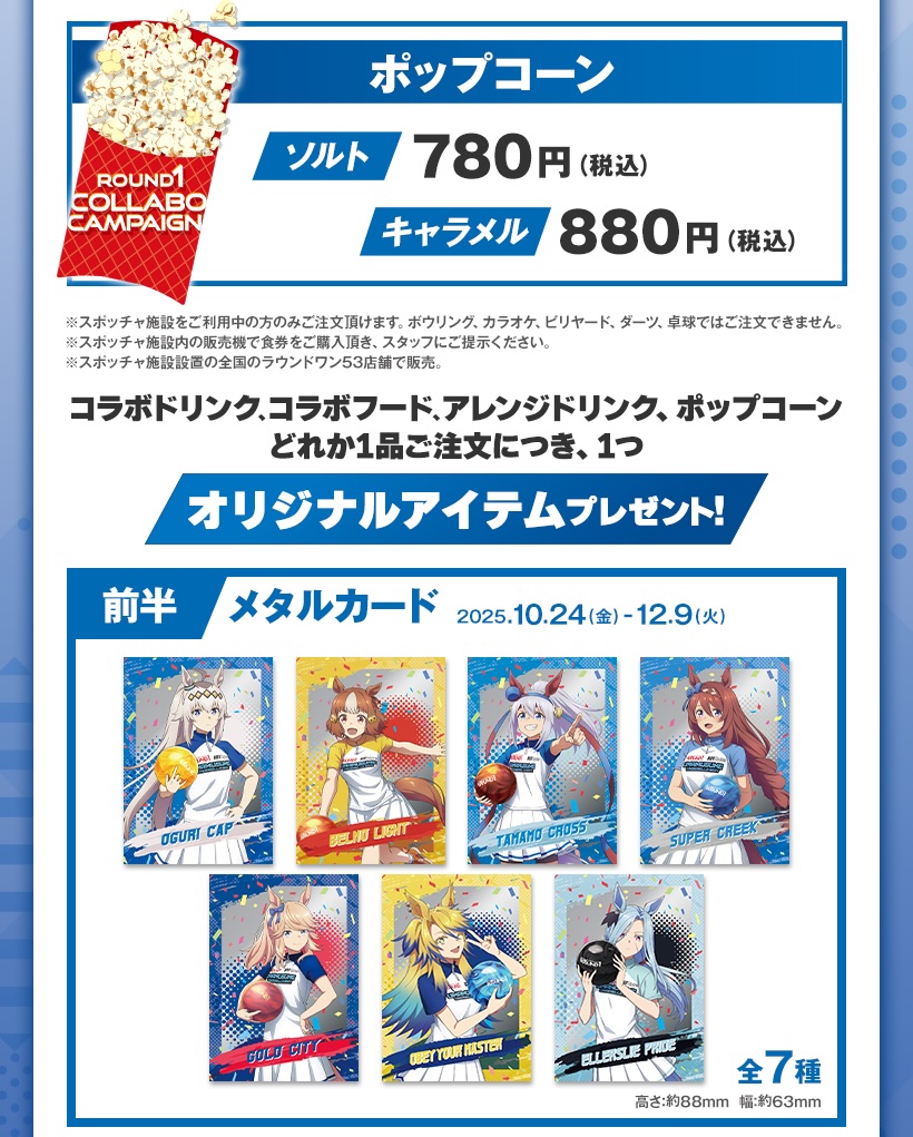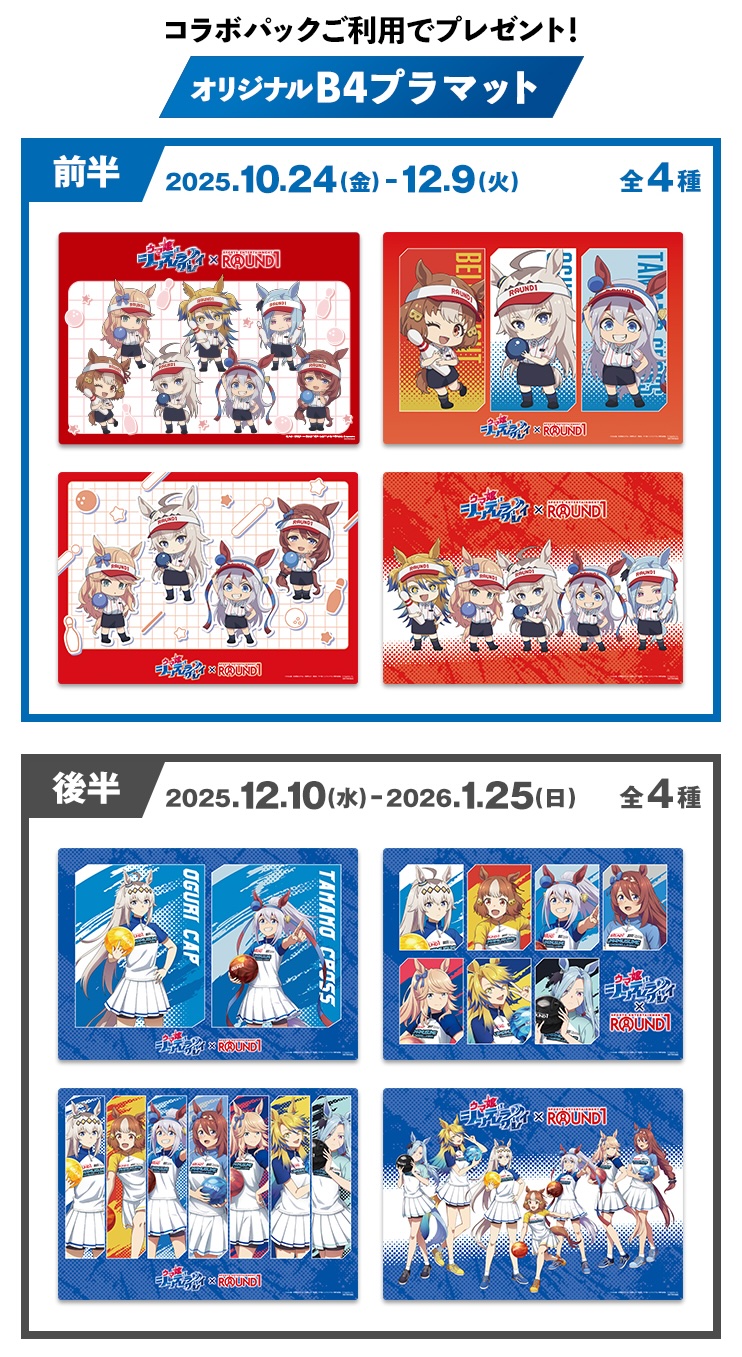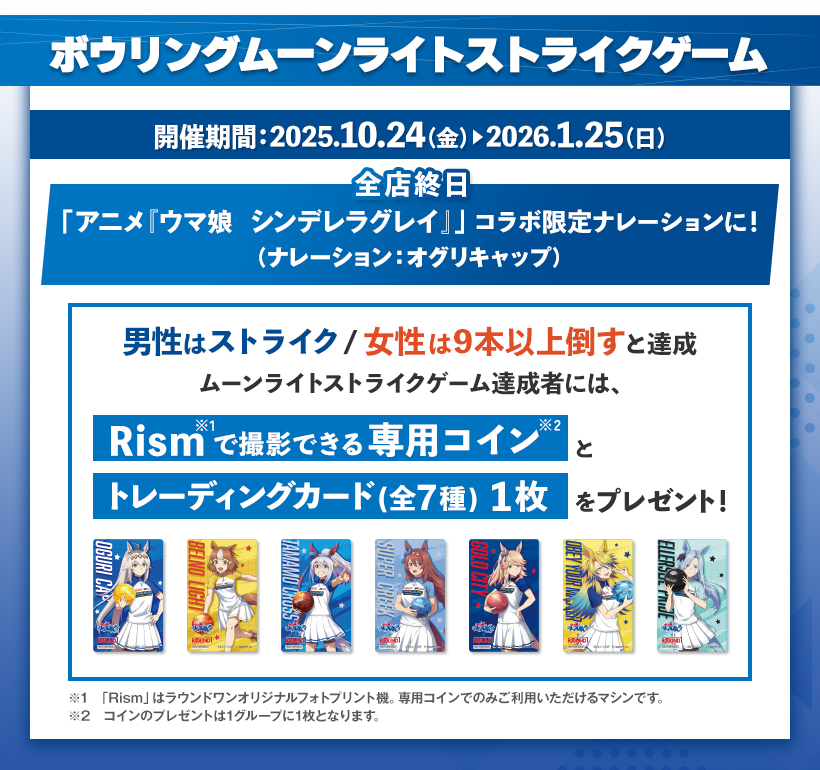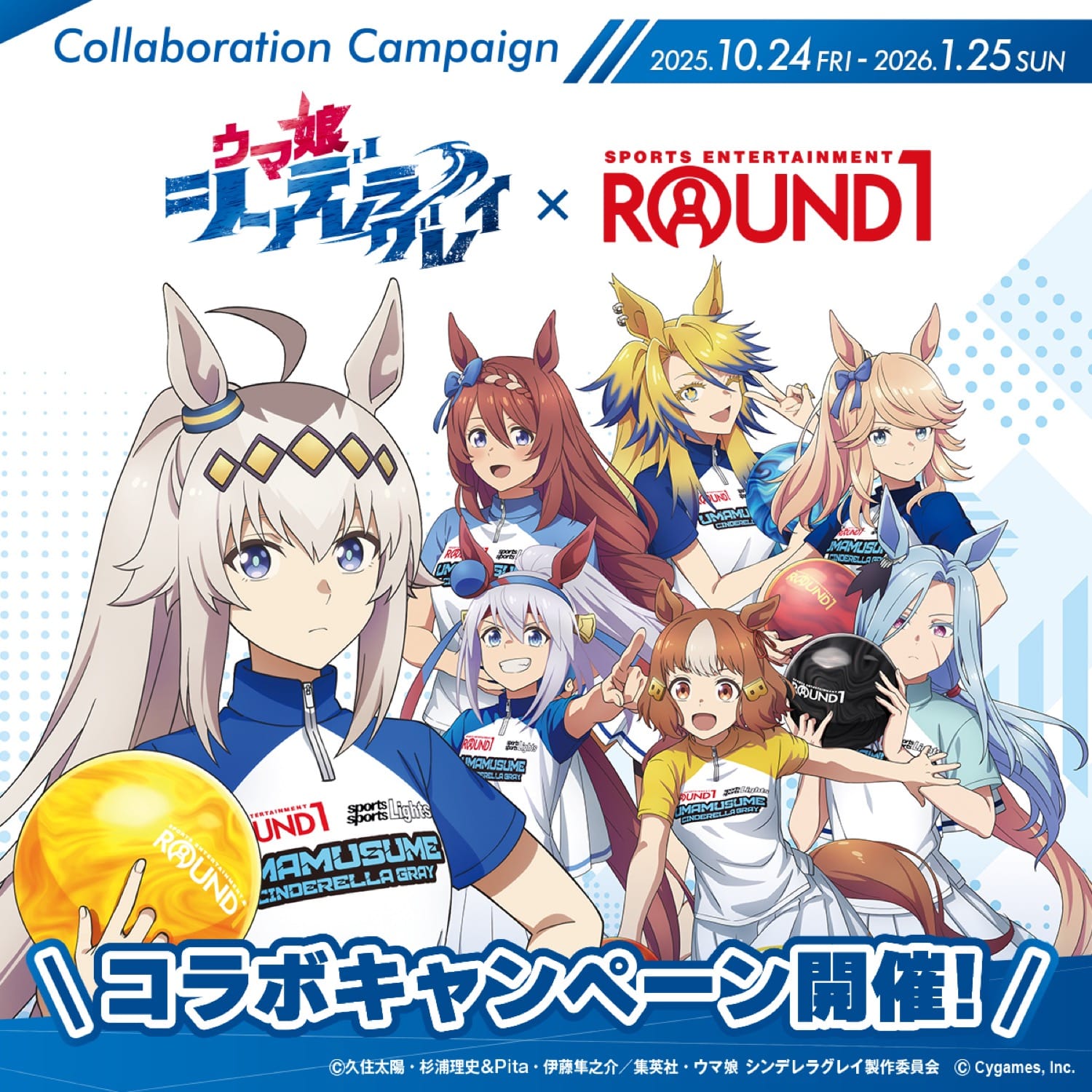 Cygames (サイゲームス) が贈るメディアミックスプロジェクト「ウマ娘 プリティーダービー」より、「久住太陽」先生によるスピンオフ漫画を原作とした大人気TVアニメ「ウマ娘 シンデレラグレイ (シングレ)」× ROUND1 (ラウンドワン) 全国にて、2025年10月24日から2026年1月25日までコラボキャンペーンが行われる。
