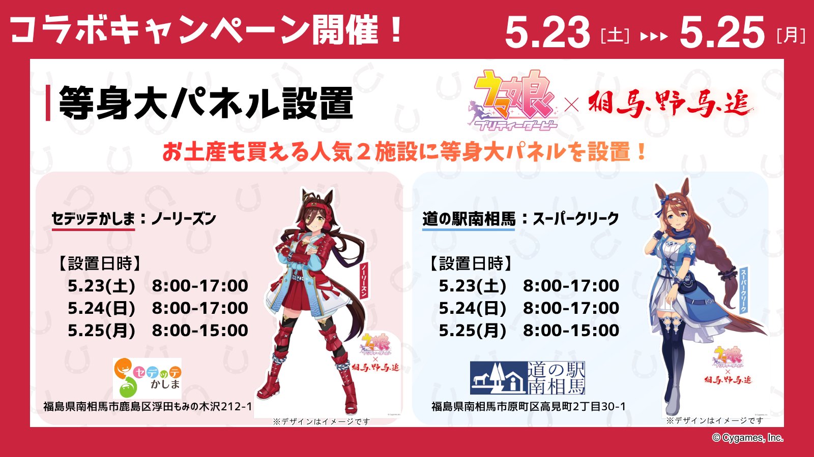 2002年の皐月賞馬で、2024年まで相馬野馬追に参加していた「ノーリーズン」号と、陸奥相馬氏33代目に当たる方が経営する牧場で生まれた名馬「スーパークリーク」号をモデルとしたウマ娘たちの等身大パネル設置、グッズ配布などが実施される。