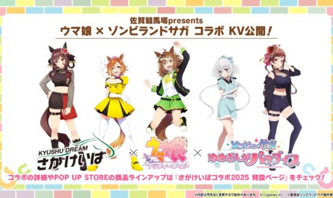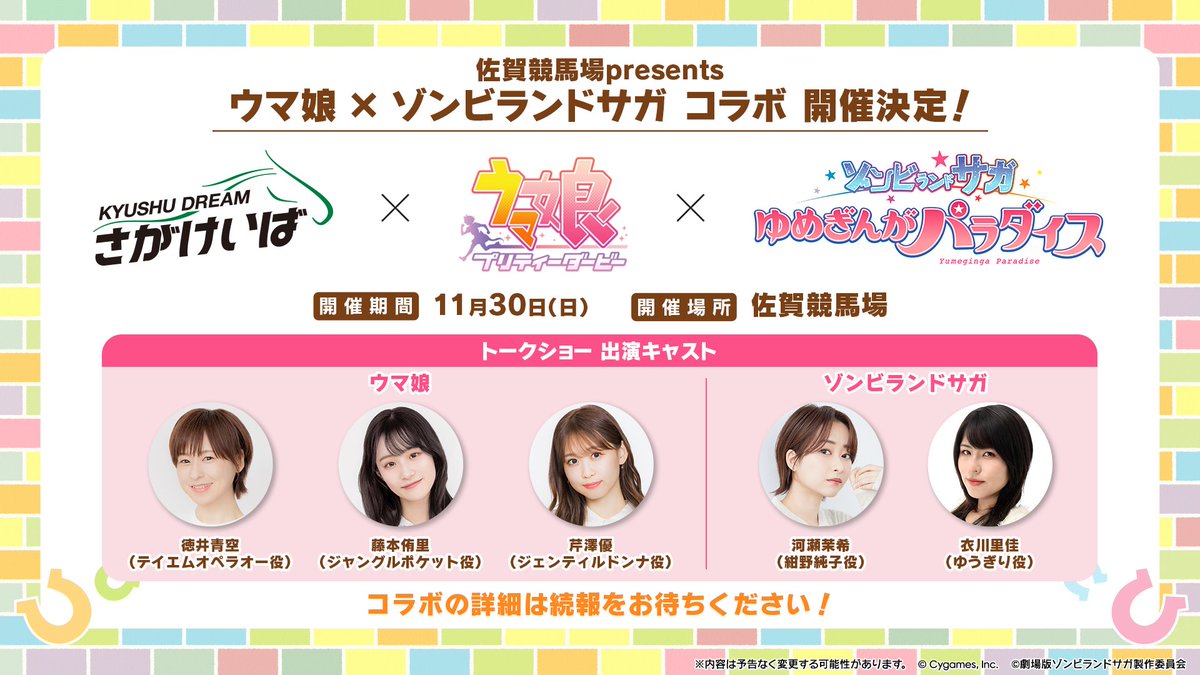 Cygames (サイゲームス) が贈る大人気の育成アプリゲーム『ウマ娘 プリティーダービー』× MAPPA制作の新感覚ゾンビアイドル系アニメの劇場版最新作『ゾンビランドサガ ゆめぎんがパラダイス』のコラボイベントが、2025年11月30日に佐賀競馬場にて開催される。
