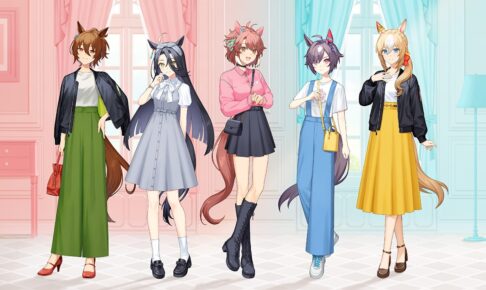コラボ詳細発表に先立ち、イラストレーターの「saino」さんによるカジュアルな装いのアグネスタキオン、マンハッタンカフェ、ダンツフレーム、ビリーヴ、デュランダルのイラストが解禁。