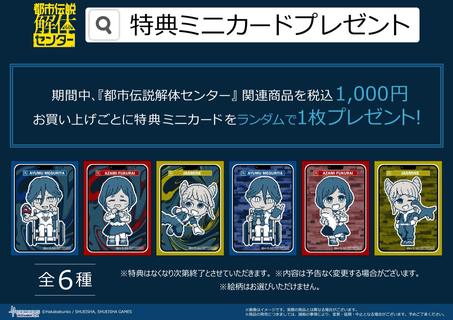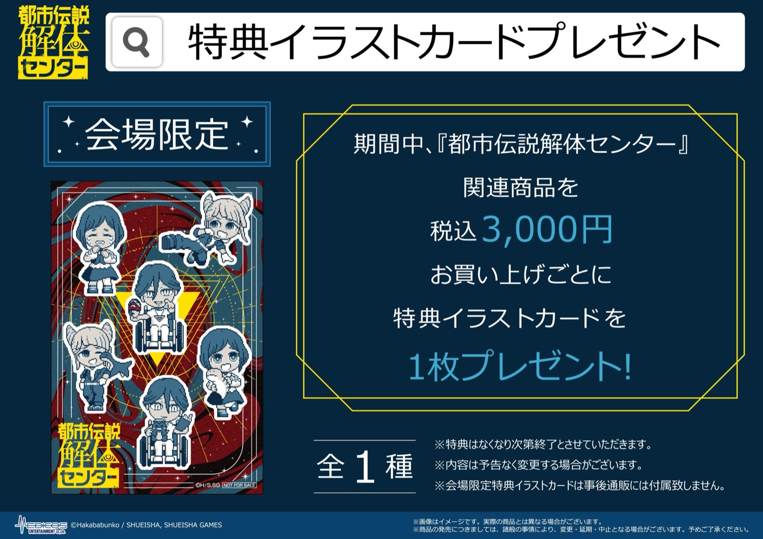 「都市伝説解体センター」ポップアップストアにて、グッズをお買い上げ1,000円(税込)ごとに特典としてノベルティー「ミニカード 全6種」をランダムに1枚プレゼントされるほか、3,000円(税込)ご購入すると、”会場限定特典”として「イラストカード 全1種」をプレゼントされる。