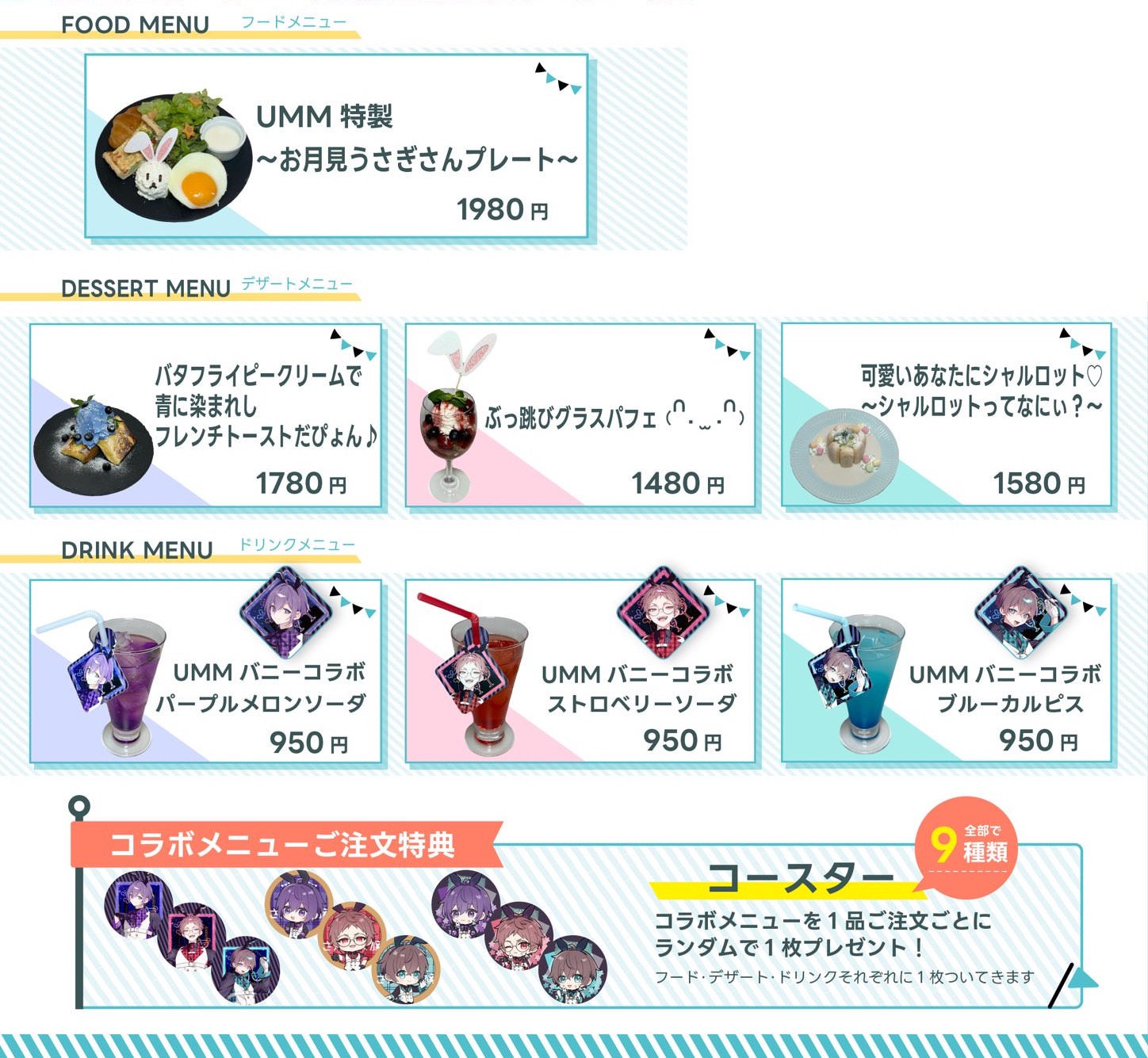 「ぶっ飛びグラスパフェ (∩^. .^∩)」や各メンバーのカラーをイメージした「UMM バニーコラボ ドリンク」など、ファン必見のコラボメニュー全7種がラインナップ!