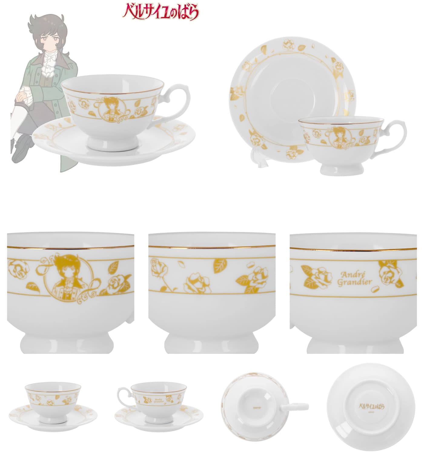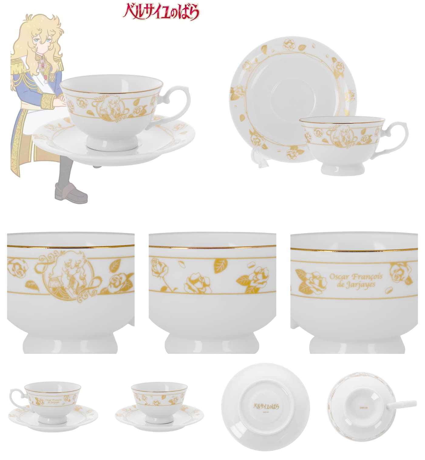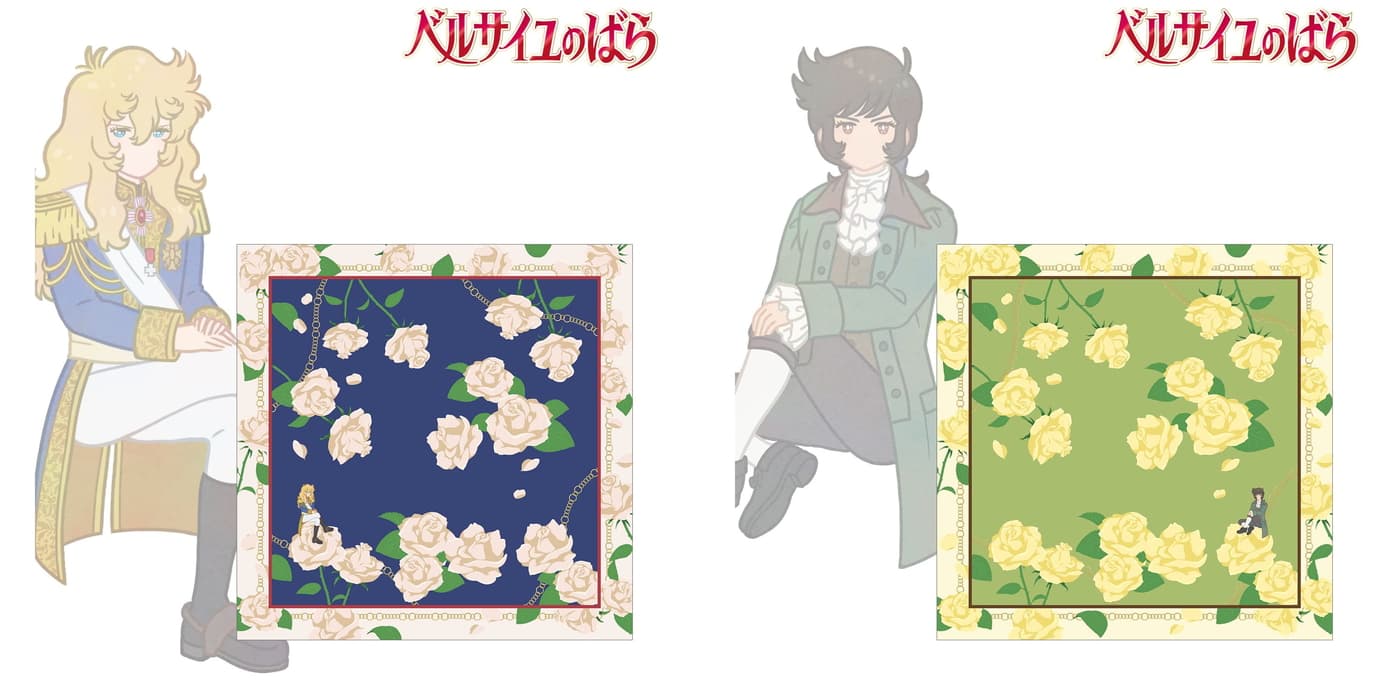 アクリルスタンド付きコースターは、コースター手前の台座にキャラを立たせれば、花々の中でキャラクターが佇むような空間を演出。スカーフはオスカルの青、アンドレの緑を基調に、薔薇の意匠とキャラクターイラストがデザインされており、軍人としての気品を日常使いできるアイテムへと昇華させている。