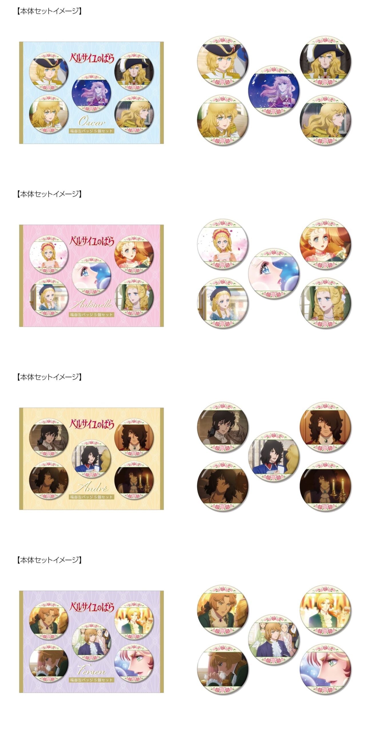 一方、劇場版の美麗なビジュアルを使用した場面写缶バッジは、オスカル、マリー・アントワネット、アンドレ、フェルゼンの4名がそれぞれ5枚セットで登場。