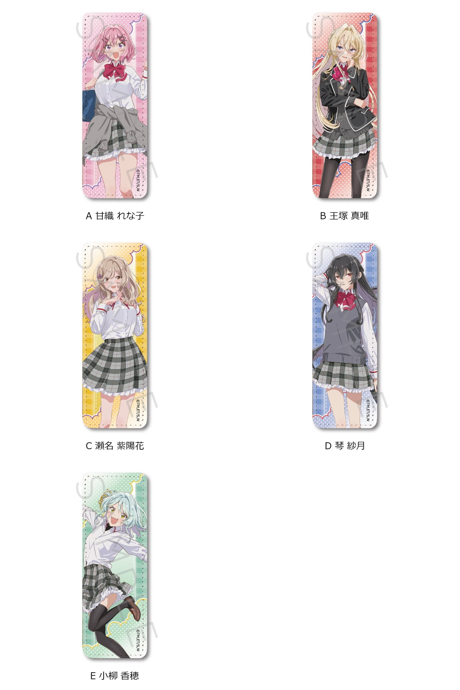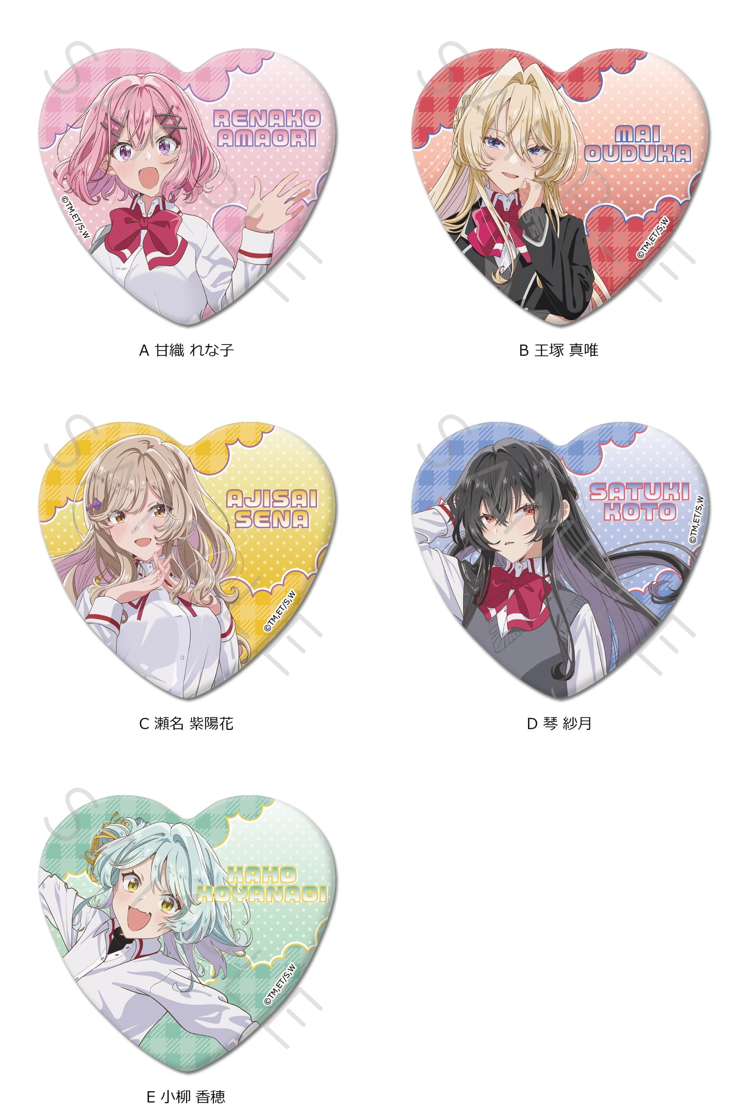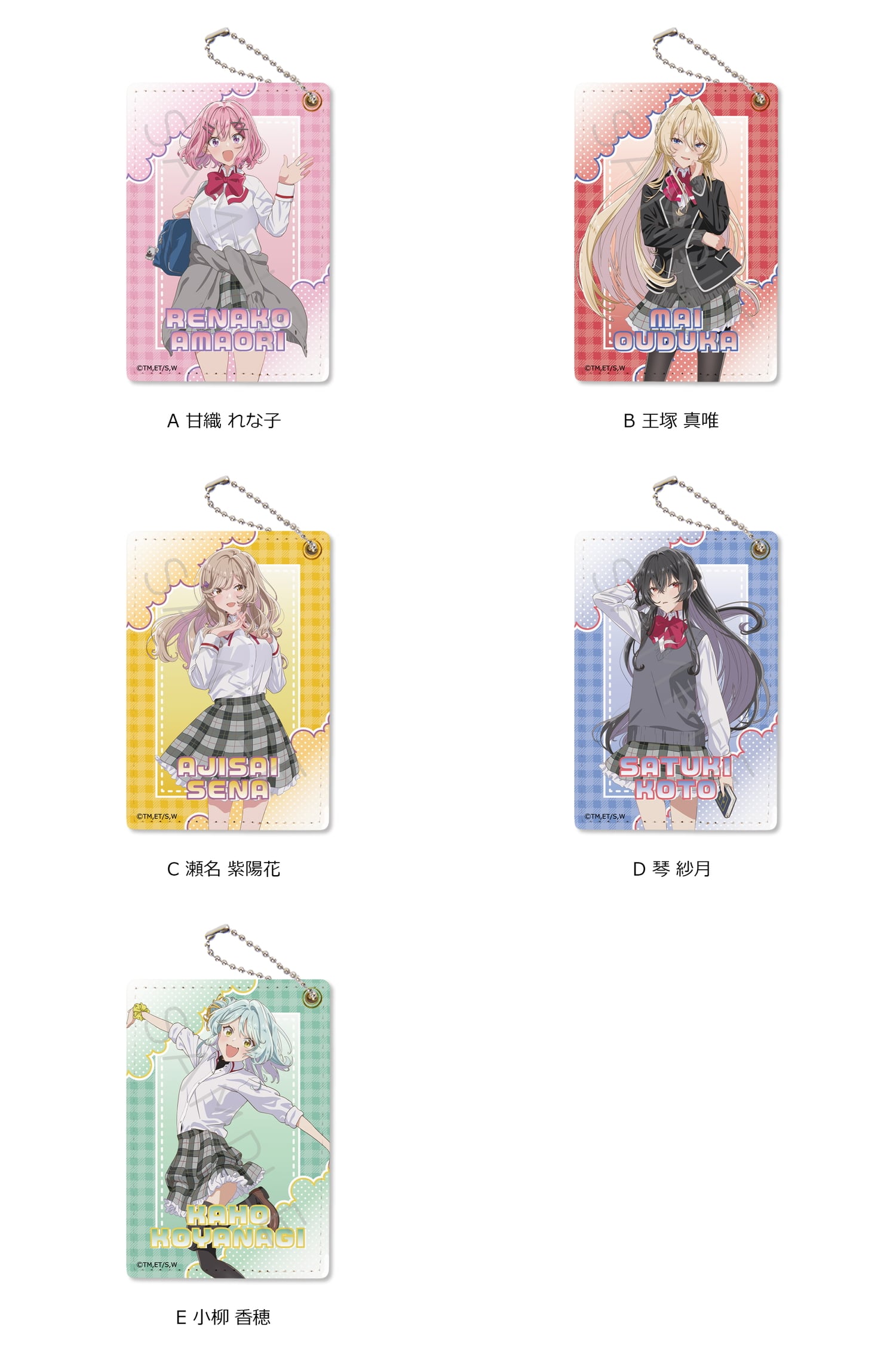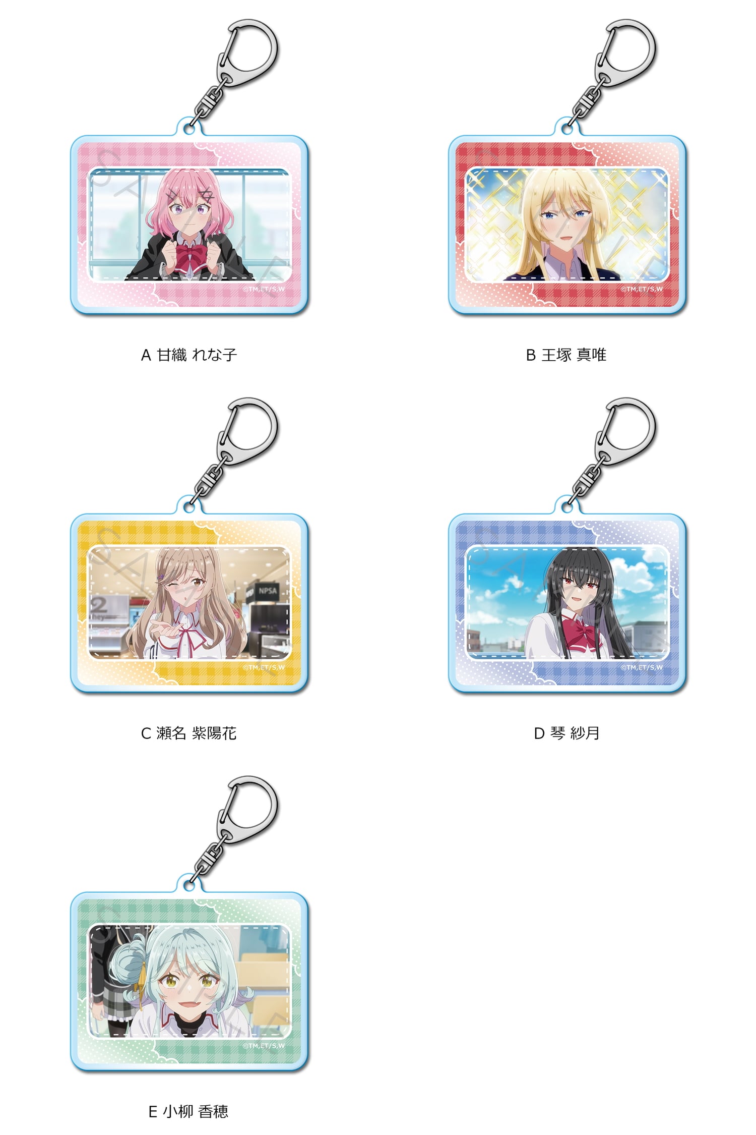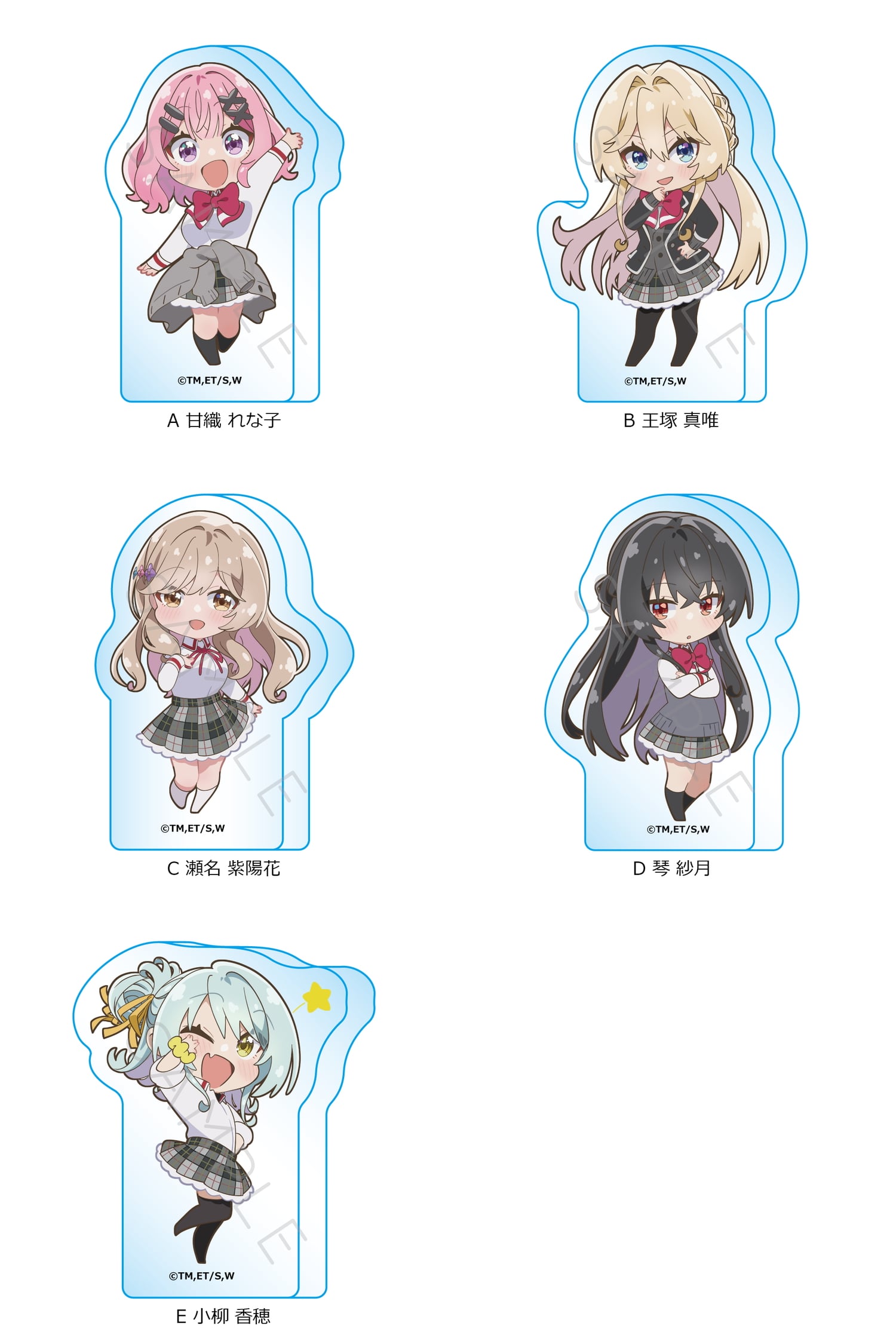 グッズには、甘織れな子たちクインテット5人の制服姿のアニメ公式イラストを使用。アクリルスタンドやハート型缶バッジ、パスケースなど、彼女たちの等身大の魅力をそのまま映したアイテムをはじめ、ミニキャライラストを使用したアクリルミニブロックや場面写を使用したアクリルキーホルダーなど、計7アイテムが登場する。