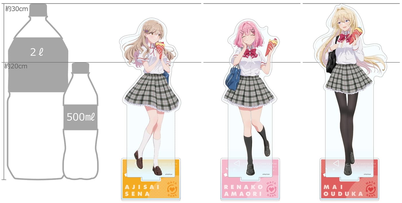 アクリルスタンドは、長辺150mm×短辺100mmの通常サイズと、高さ約29〜30cmの特大サイズを展開。